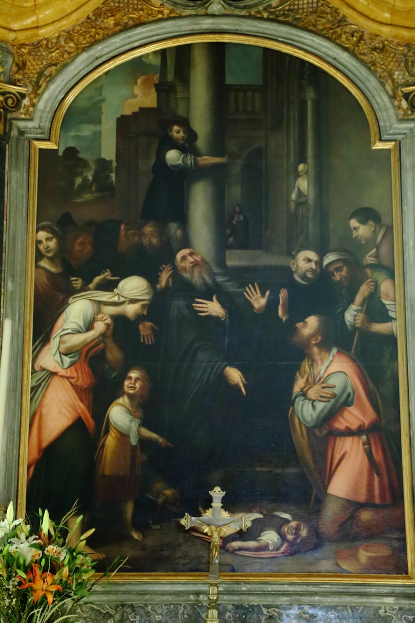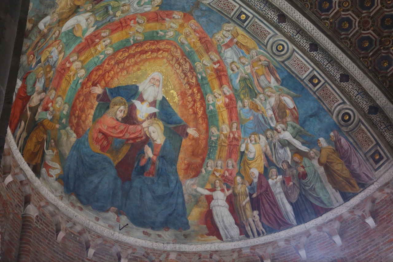 実際に地元の人が利用している教会なのでしょう。入口付近には掲示板が置かれ、信者の方に向けたお知らせが張ってありました。特に観光客に向けた注意とかは無かったです。中は広くて質実剛健、礼拝堂や祭壇を除けば華美な装飾はありません。私が行ったときは管理の方の他、一人か二人居るだけで、閑散としていました。一応、祭壇画のマリアの戴冠が有名らしいのですが、観光名所としてはメジャーでは無いのだと思います。交通の便も良くありませんし。ただ、観光地化した教会よりもこういった教会の方が味わいがあります。実際、歴史ある宗教施設が持つような厳粛な空気を味わえました。近所に行くのであれば是非足を延ばしてみてください。