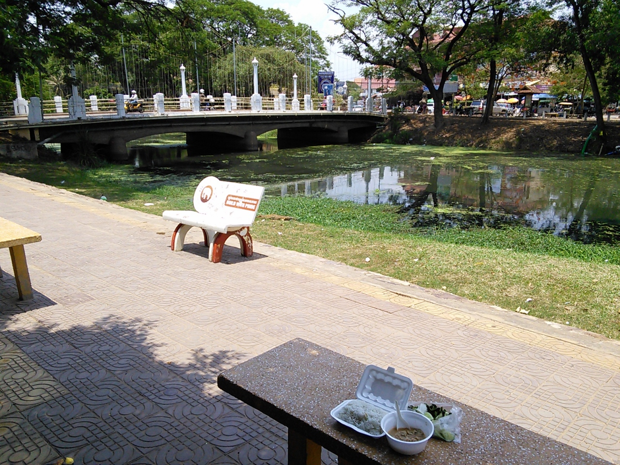 ざっくり言うとマーケットの北半分はローカル市場、南半分は観光客用の土産物屋といった感じです。1ヵ所で2つの雰囲気を味わえるのでお得な場所でおもしろいところです。もちろん食事もできます。北側の通り沿いの一画にローカル風な食堂が並んでいますが値段は観光客用、おかず一皿とご飯で2ドル(と言われた)です。市場中央部の生鮮品売り場にはおかず屋があります。ここで昼飯を購入、おかず1品とご飯で3000リエル(0.75ドル)です。野菜もサービスで付けてくれます。持ち帰り専門なのでちゃんと容器とスプーンも付きます。市場の南側の川沿いにはベンチがあるのでそこで気持ちよく食事ができました。