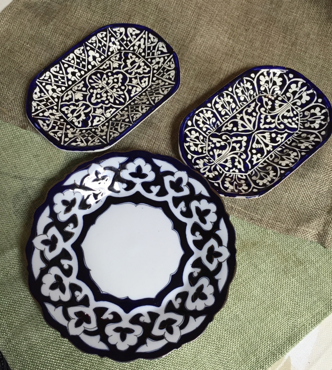 サマルカンドのシヨブバザールでは、金縁がなく青みの薄いソーサーサイズに4500スムの値札が付いているのを発見。割物なので最後のブハラで買うことにし、デフコンバザールへ行くと、同じソーサーサイズで金縁があり、濃紺の色味の綺麗な物が5500スム。納得し、一回り大きな直径17cmの物の値段を聞くと6000スム。2枚買うことで計10000にしてくれました。バザールなので、まとめ買いの値引きは5枚くらいからかな、と思いましたが、聞いてみるものですね。