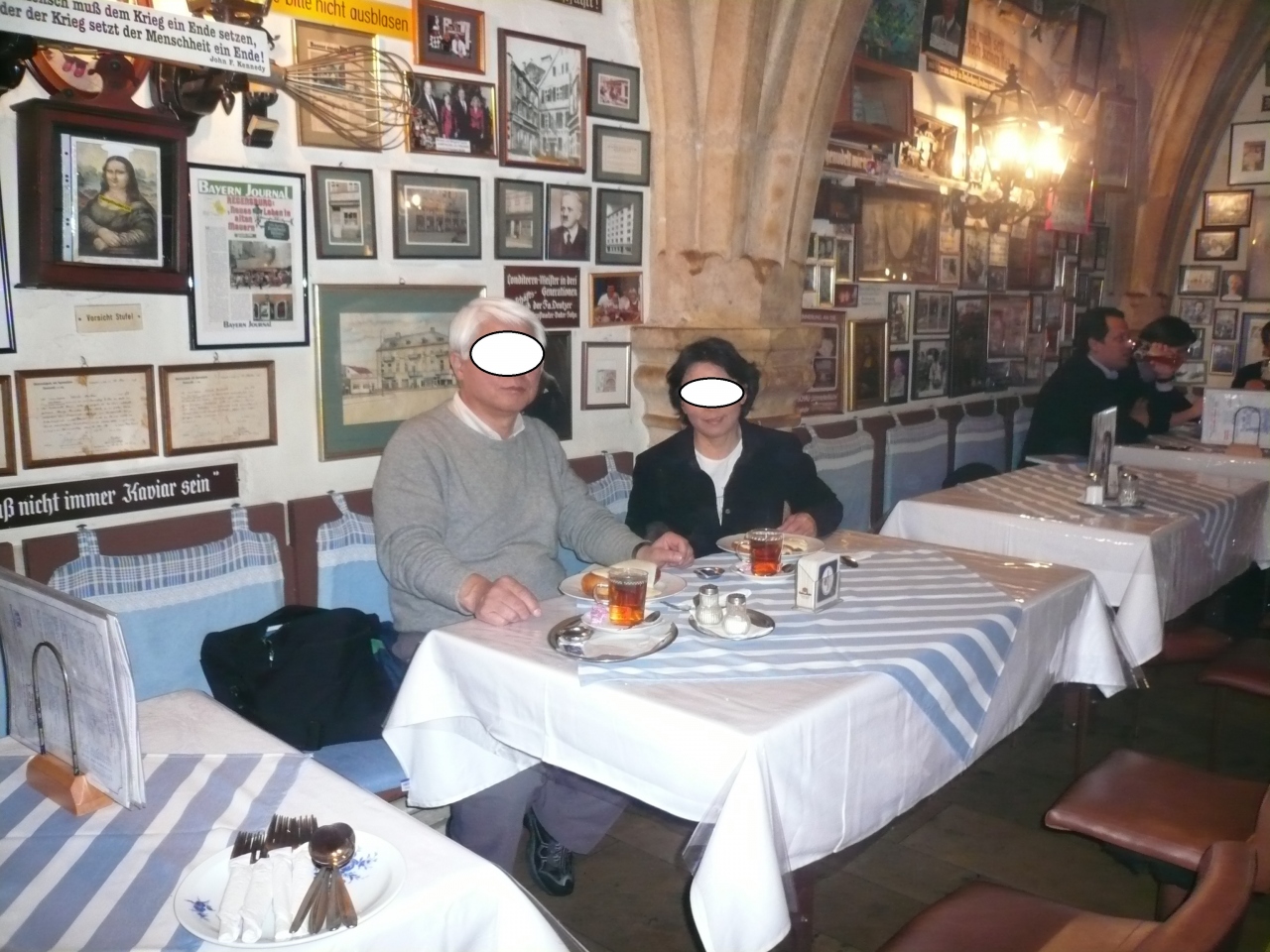 私どもが座った席の後の壁に、こげ茶色の板に白抜きの文字が張ってあった。 “Es muss nicht immer Kaviar sein。(いつもキャヴィアが要るとは限らない。)” 声に出して読むと、隣の席にいた50代前半の女性がこれを聞いて、笑いながら、“そーそー!!”と言って相槌をうった。
