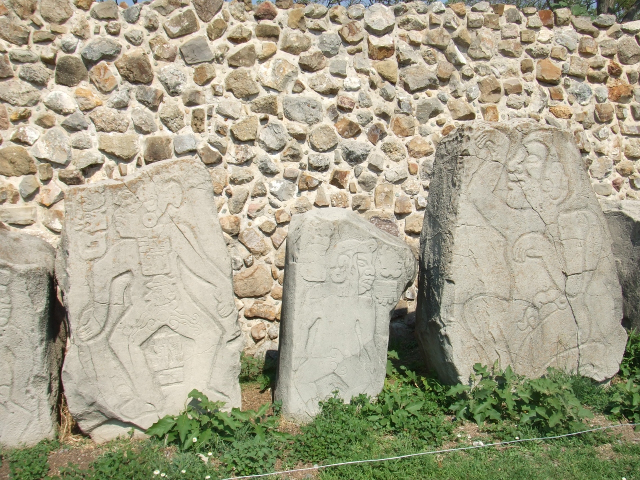 コミカルに踊っているように見える人々は、実は捕虜になった人達が裸にされ、拷問や辱めを受けて殺されたところを描いたものだそうです。そう知ってしまうと複雑な気分。この石碑が壁面に300枚も埋め込まれていたそうです。現在モンテアルバンの外に置いてあるのはレプリカ。本物はシティの考古学博物館等に展示されているようです。