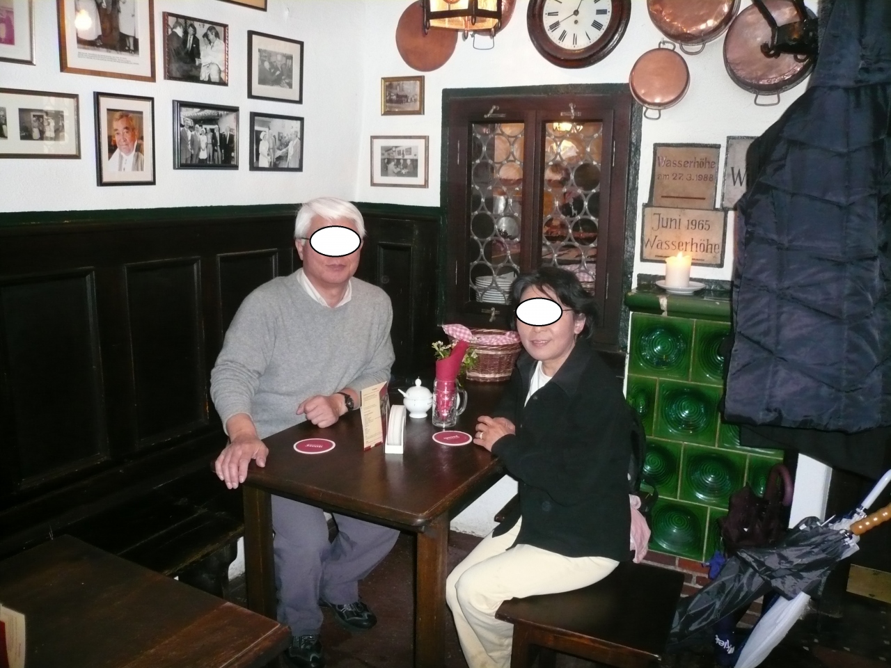 古めかしい室内は様々な有名人の写真などが掛けてあり、Hochwasser大洪水の記念碑(版)もある。それらは店内のどこまで水位が来たかと記したものだが。1954年7月の洪水は家内の背丈(148cm)ほどの高さだ。その他にも1965年6月、1988年3月のドナウ川大洪水が記録されていました。
