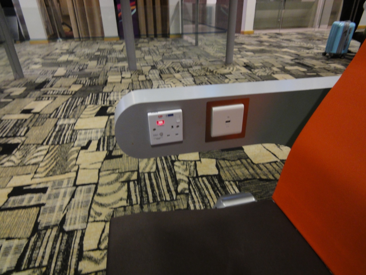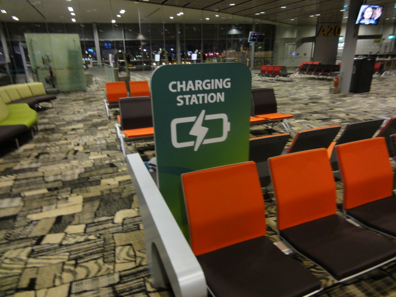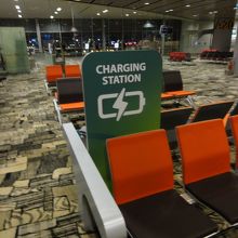 T3のA16搭乗ゲート付近に「Charging Station」という電子機器の充電ができるベンチがあります。肘掛の脇にUSBポートと家庭用電源ソケットが備えられています。家庭用電源のプラグはシンガポール国内ようですが、日本用変換プラグを旅行用に持っていれば利用は可能です。搭乗待ちの時間に、スマホやデジカメの充電にはもってこいです。