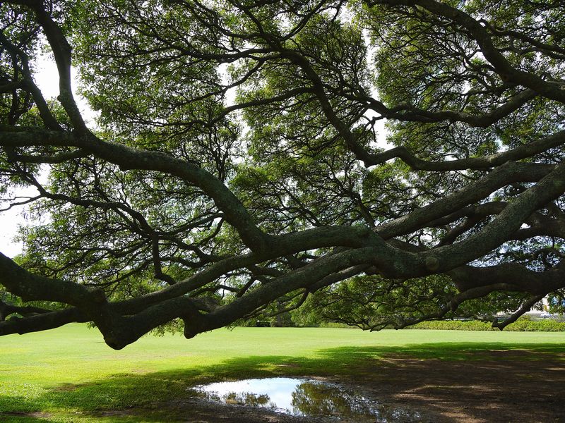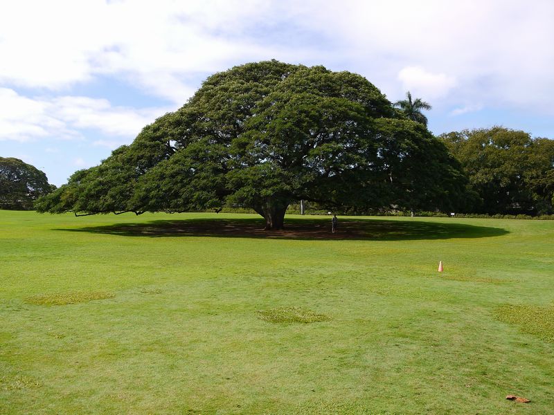 日立の樹は駐車場の南方向にあり、広い敷地の中にありました。どの樹か調べてから行きましたが、日本人の観光客が多くいるので分かりやすいと思います。モンキーポッドという種類で、木の端から端まで40メートル位あり太い幹から多くの枝が分かれ広い樹の下に入ると強い生命力を感じることができました。