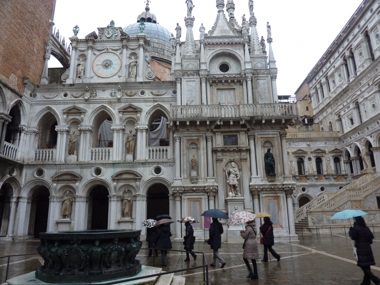 ヴェネティア共和国総督の政庁として建てられ、幾度かの火災に遭い、15世紀に現在の建物になりました。サンマルコ寺院の右手、宝物館の裏手に在ります。2階の廊下のアーチから中庭と鐘楼が見え、3階に登る階段はそれ自体が豪華な造りですが、その天井は黄金に輝くレリーフで覆われています。階段から先の室内は写真撮影禁止です。牢獄まで回れるようになっており、ためいき橋を渡って、小窓から外の景色を見る事もできます