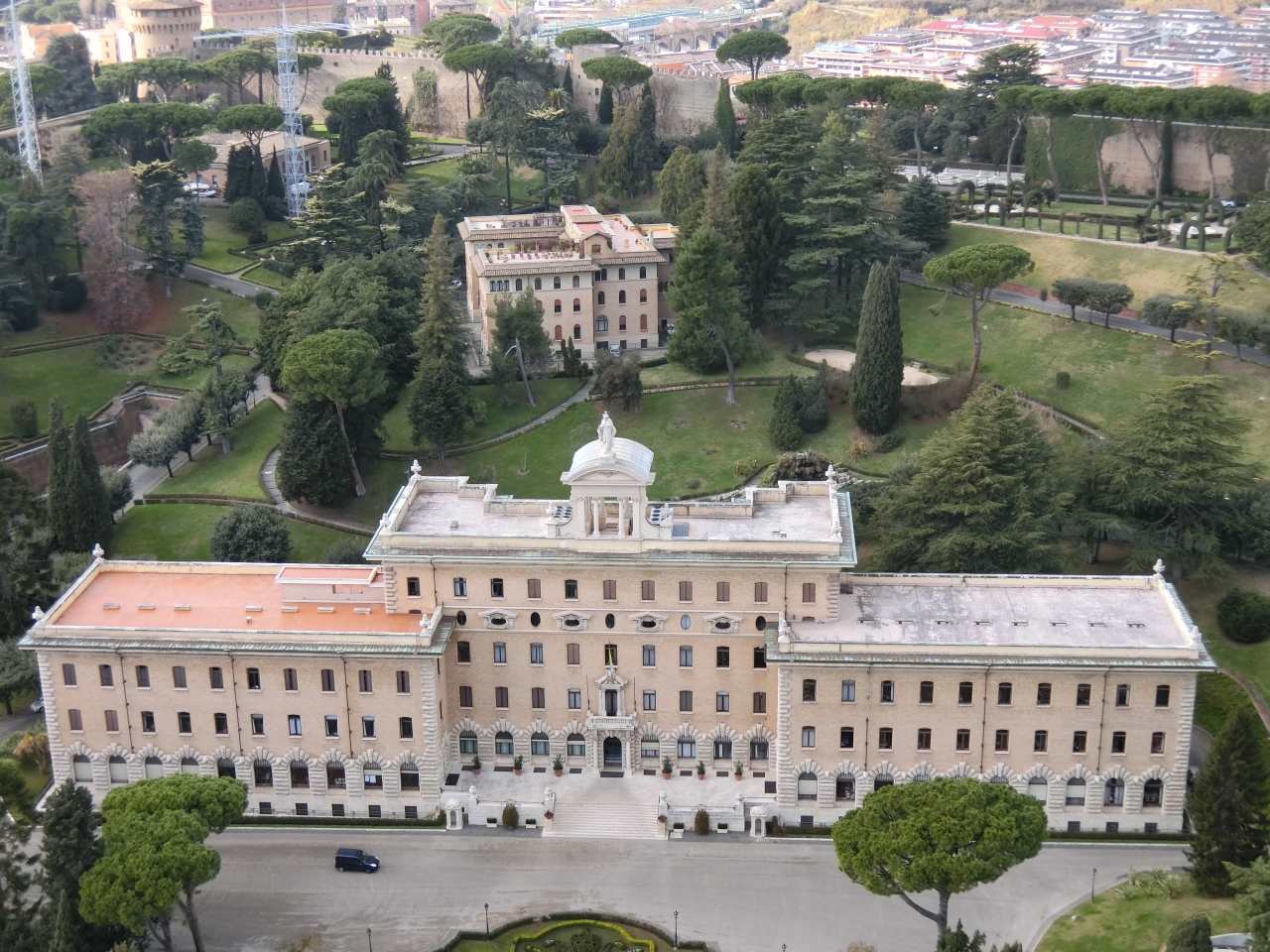 サンピエトロ広場の反対側には政庁など国家機能の建物があり、その周辺はバチカン庭園として美しい環境を保っています。