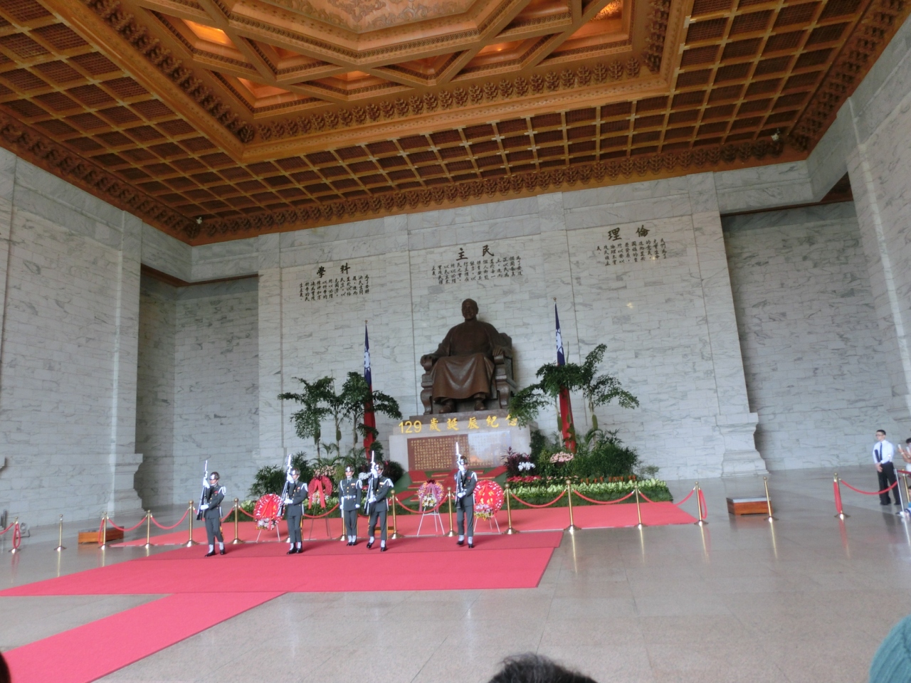 台北を代表するスポットなので行くのはいいけど、大したことはないです。ホールの中央には蒋介石の像が建っており、1時間ごとに衛兵交代式が行われています。交代式の間はすごい人だかりでした。やはり中国人がとても多く、興奮気味でした。