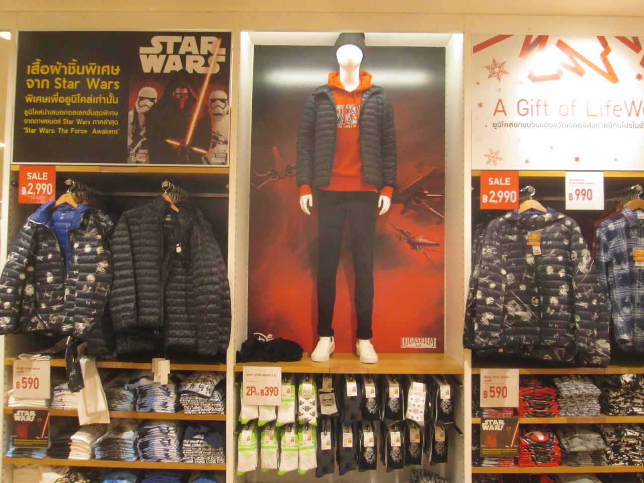 最新作「スター・ウォーズ7/フォースの覚醒」の公開を記念してユニクロのオリジナルプリントウェアが販売されていました。バンコクでもスター・ウォーズが人気のようで、店内で期間限定の商品をディスカウント価格で扱っていました。