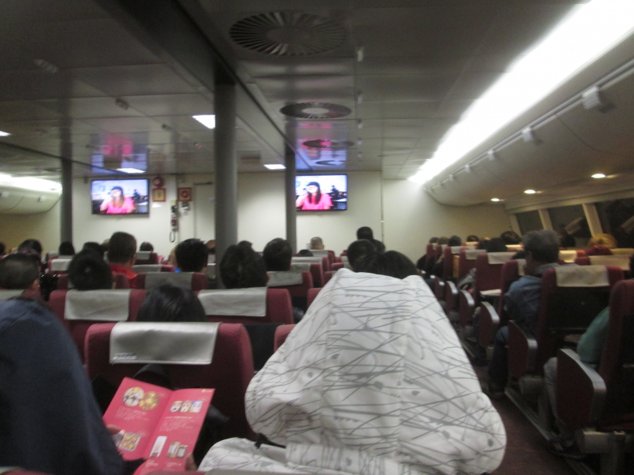 土曜日の夕方はもっとも混雑する時間帯で、マカオ方面のターボジェットの船内は満席でした。船内のモニターではマカオの観光案内を中心に紹介の映像が流れます。セナド地区の世界遺産、マカオタワー、タイパ島、カジノなど到着前におすすめの観光スポットが確認できます。