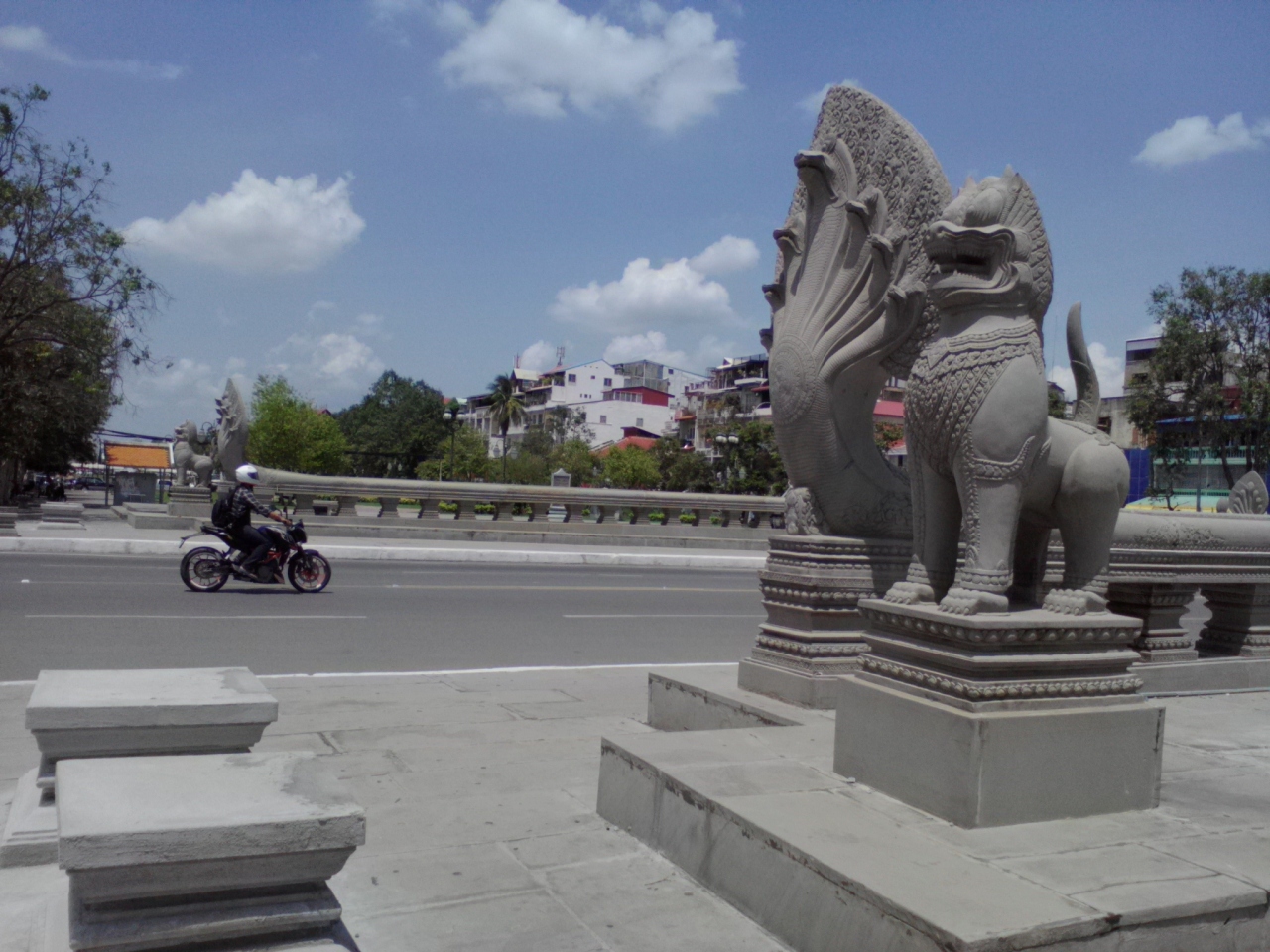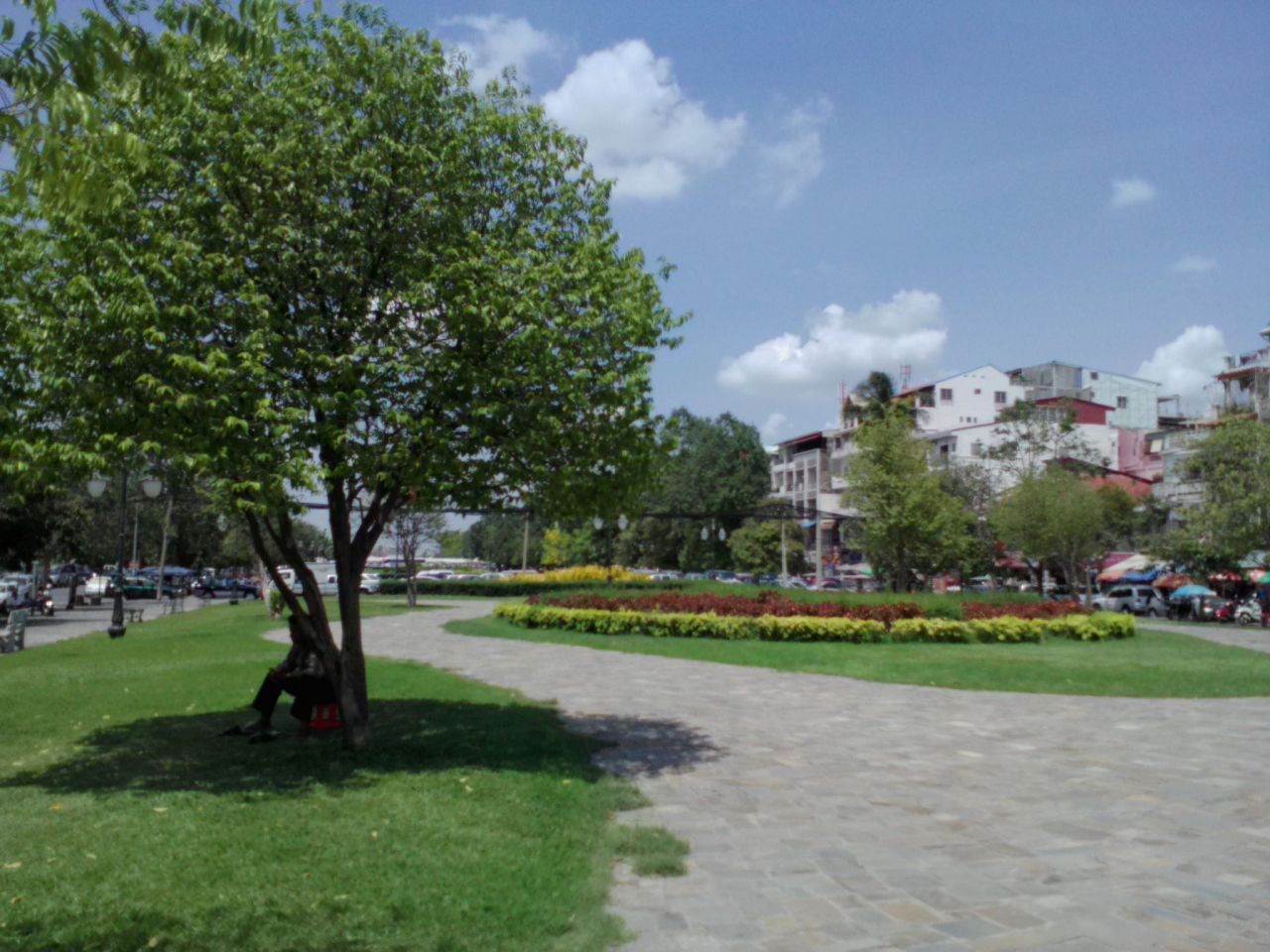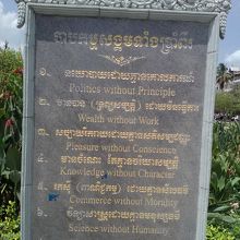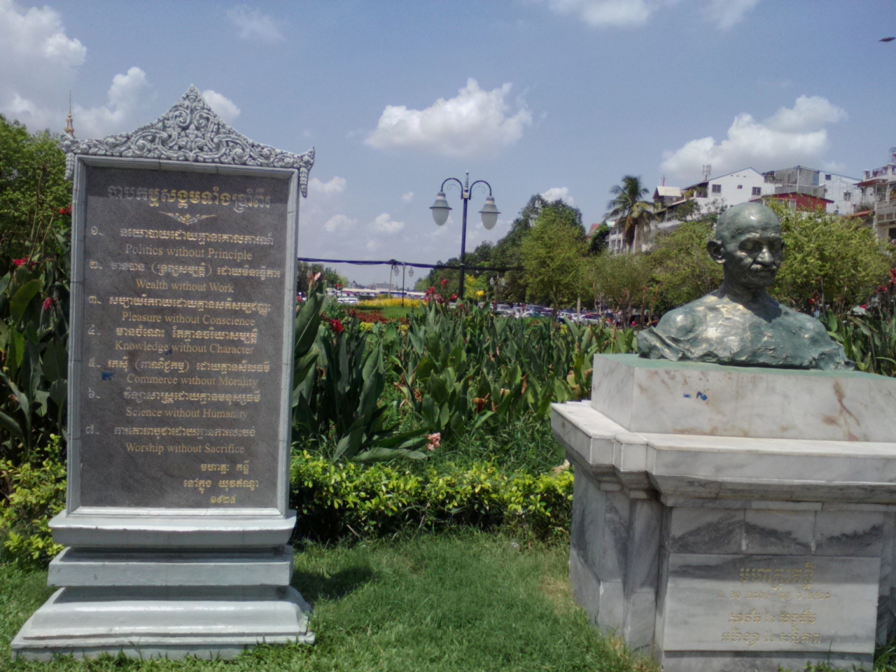 ナイトマーケットから西側に500mほど続く細長い公園です。芝生や花が植えられて憩いの広場のようです。中央付近をノロドム通りが通っておりそこにはナーガ神の橋がかかっています。ということはこの公園はもともとは川だったということです。“フタ”をしてしまったんですね。その橋の東側のたもとに意外な物を発見しました。なんとあのマハトマ・ガンジーが唱えた「七つの社会的罪」(詳しくは省略、気になる方は調べて下さい)がガンジーの胸像と共に石碑に刻まれているではありませんか。う~ん、なんでまたこんなことろに…。