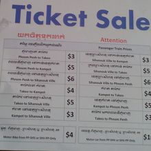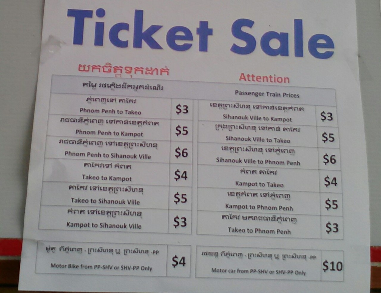 現在、金,土,日の週末のみプノンペンとシアヌークビル間で運行されています。金曜は15:00発、土曜日曜は7:00発の1日1本のみです。シアヌークビルまでは6$。その他の料金は写真を参照して下さい。チケットは駅の窓口で予約できます(8:00-15:00)。