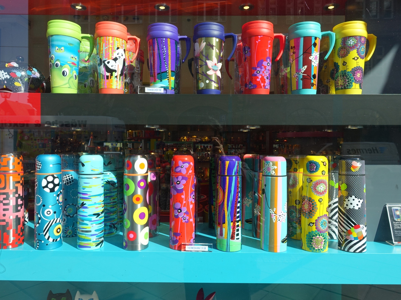 こちらのお店で売られている水筒は、色鮮やかで様々なデザインが施されています。