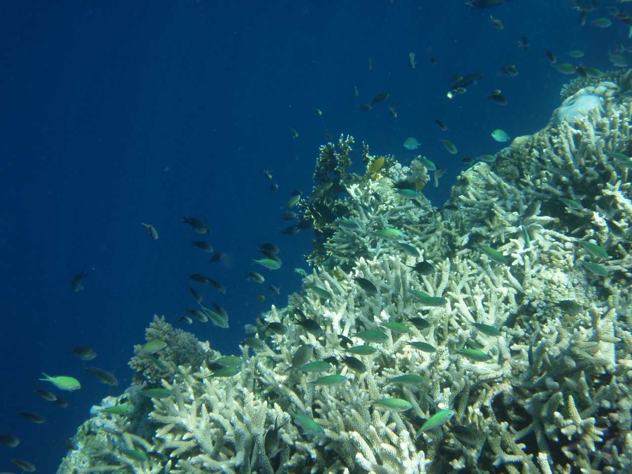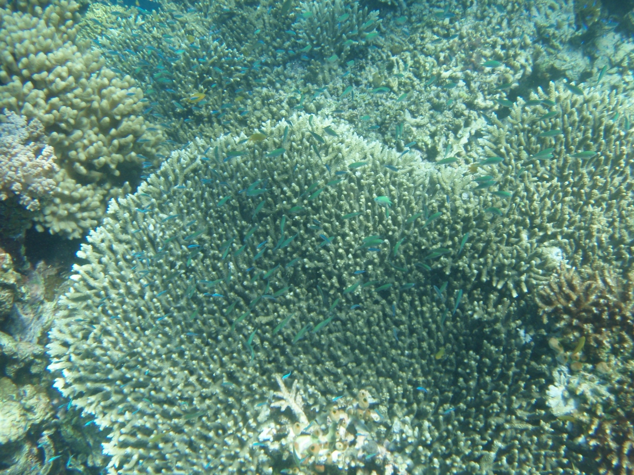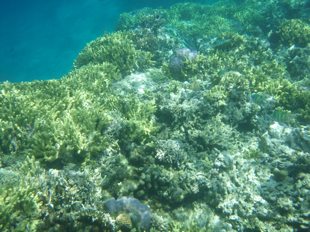 早速POST 1 の周りをスノーケリングをする。黄緑色のサンゴが多く、岸より30mでドロップオフになっています。サンゴは比較的元気です。
