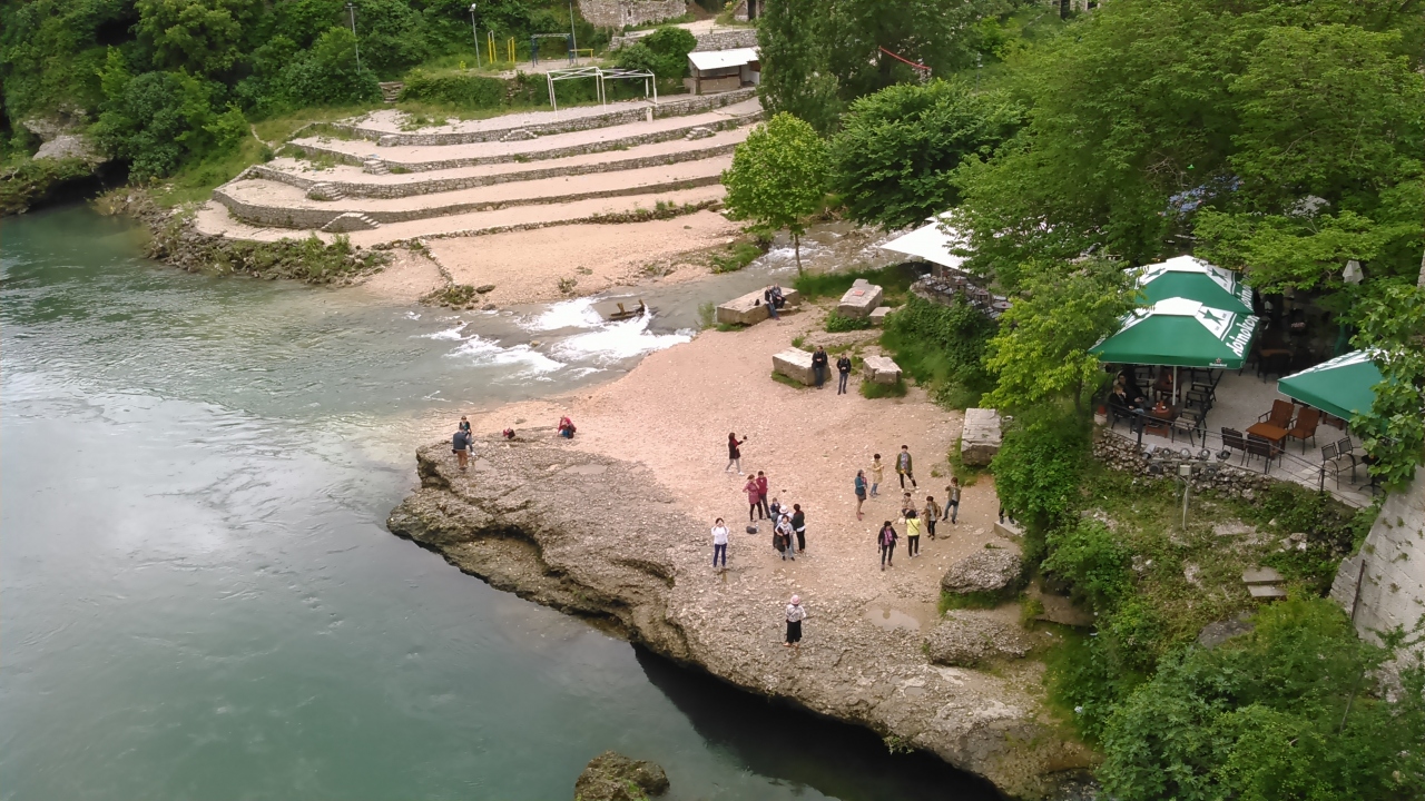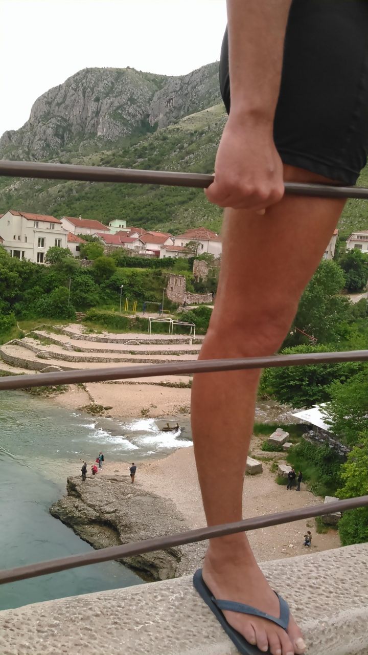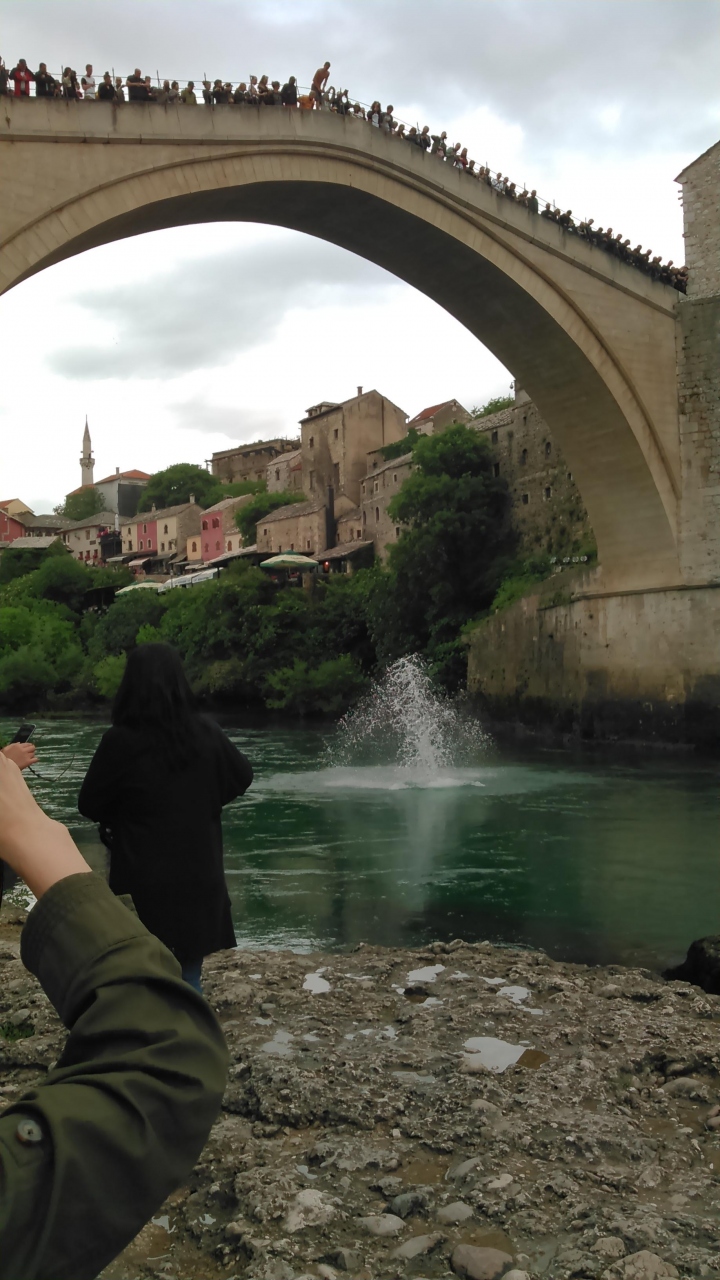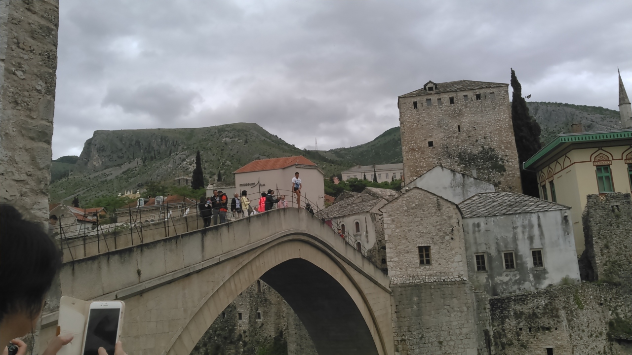 ツアーで訪問しました。街のあちこちに砲弾の後が残っていました。橋は砲撃によって破壊されたものの、ユネスコなどの援助で復元されました。橋は勾配が急ですが、一歩ずつに滑り止めがあり、滑ることはありません。橋の上から25ユーロ集まるとダイビングする人がいて、偶然それを見ることができました。