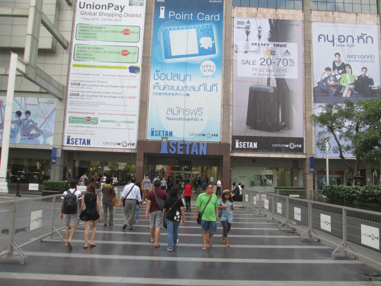 2015年8月17日、ラチャプラソン交差点にあるエラワン祠で爆発事件が発生しました。近くにある伊勢丹では警備が強化され、敷地に入る前に1回、さらに、お店のエントランスでもう1回、警備員による荷物検査を行っていました。治安的には問題ないように感じましたが、敷地前には柵ができており普段より異なる雰囲気を感じました。