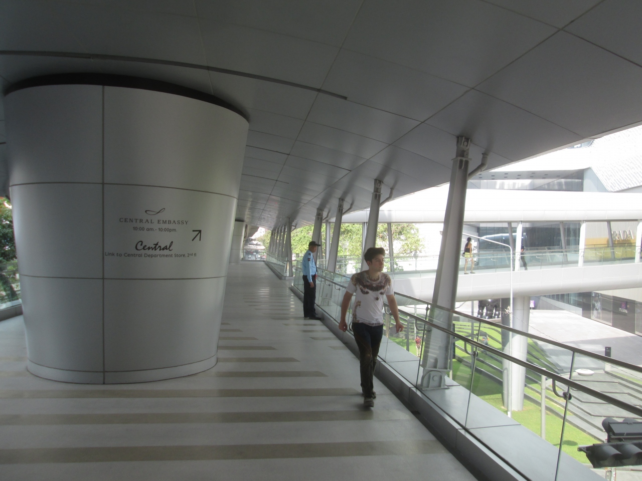 セントラルエンバンシーの2階エントランスにスカイウォークがつながっています。行先表示があり分かり易いです。駅と結ぶスカイウォークには警備員が配置されていました。開店する朝10時から利用可能となります。