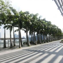 ショップス・アット・マリーナベイ・サンズの海側には椰子の並木が涼しそうな板張りの遊歩道が続いている。