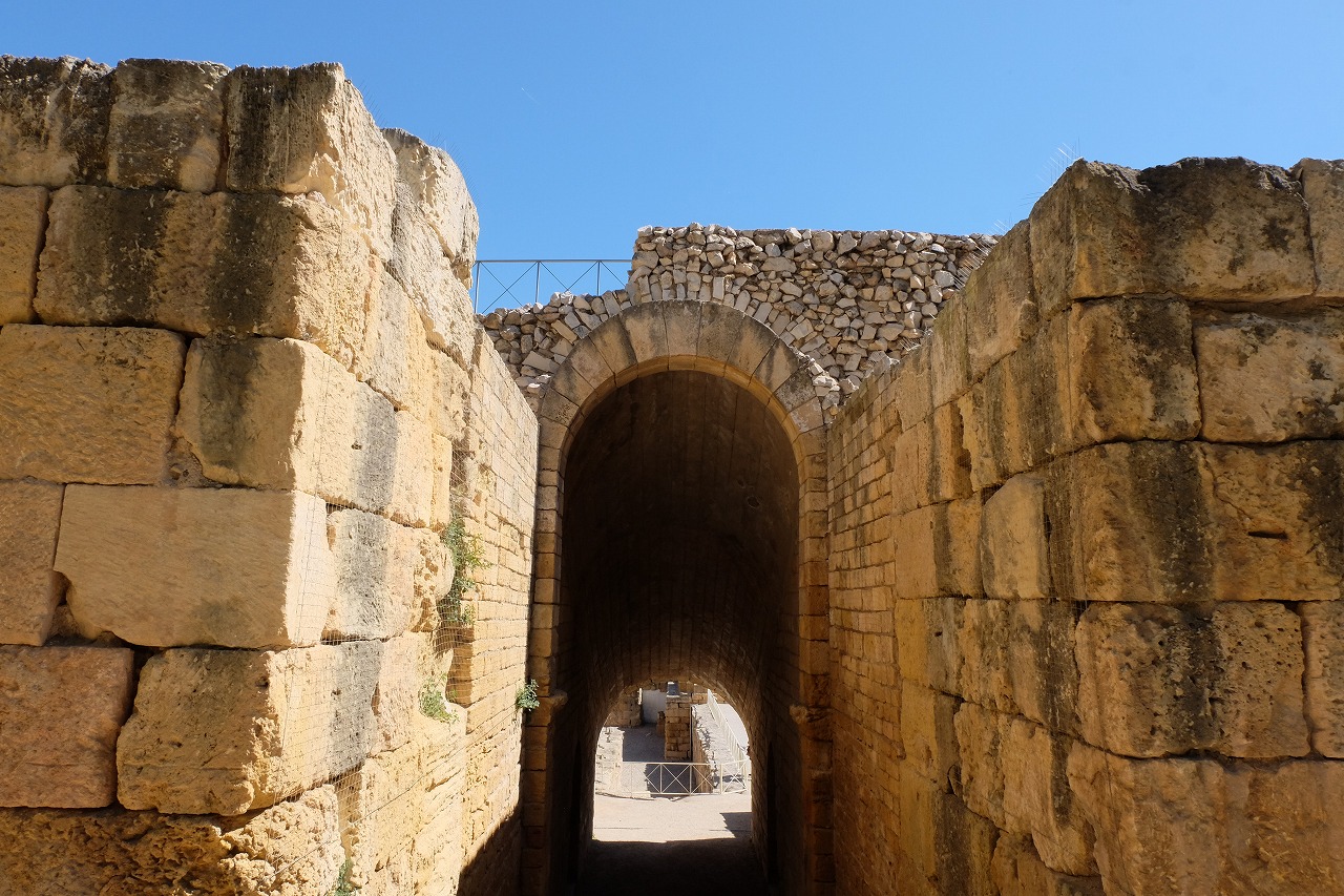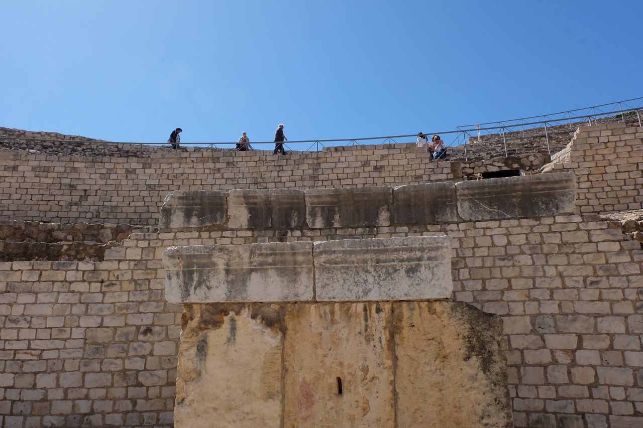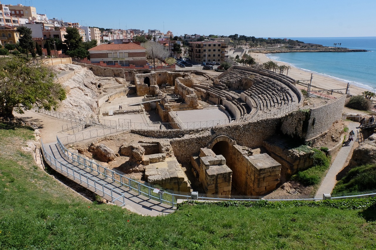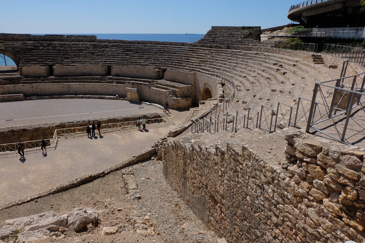 タラゴナ駅から15分、海岸に近い場所にローマ円形競技場があります。かなり小さめでキャパは1000人ぐらいか。円形競技場、楕円競技場と長官公邸、城壁、さらにフォーラムに入場可能なコンビチケット7.40ユーロ。座席は半分だけ残っています。アリーナの中央には後年に建てられた教会の廃墟が残っています。