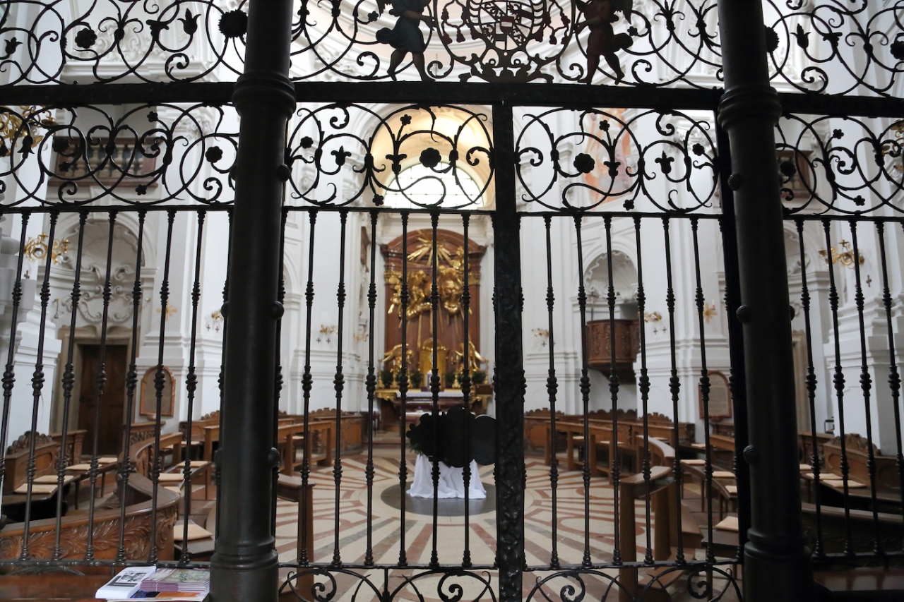 何故か判りませんが、オーストリアの教会は入口を鉄格子でふさいでいる所が多いですね。こちらも表の扉からは入れるのですが、入って直ぐに鉄格子に邪魔されてしまって内部をじっくりと見ることが出来ません。何とか祭壇部分と、天井画が見られるくらいです。ミサの時には開けるのでしょうが、流石にミサのときに写真を撮り捲くる度胸はありません。バロック調の美しい教会なので、非常に残念です。