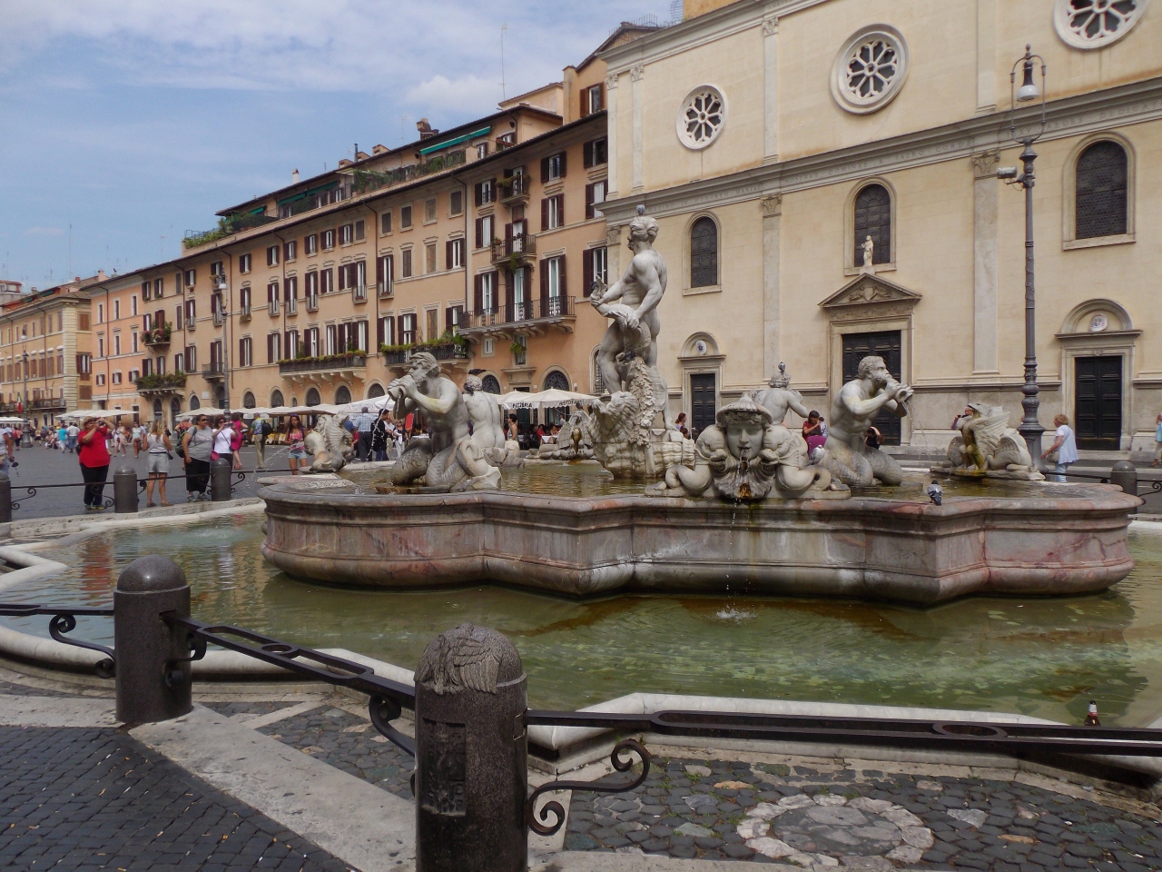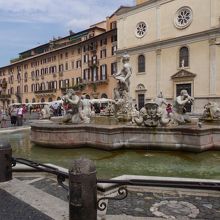 いつもにぎわっているローマの有名な広場です。3つの噴水があり、中央の四大河の噴水はベルニーニ作。周辺はレストランや土産物屋さんが豊富にあり散歩も楽しいエリアです。