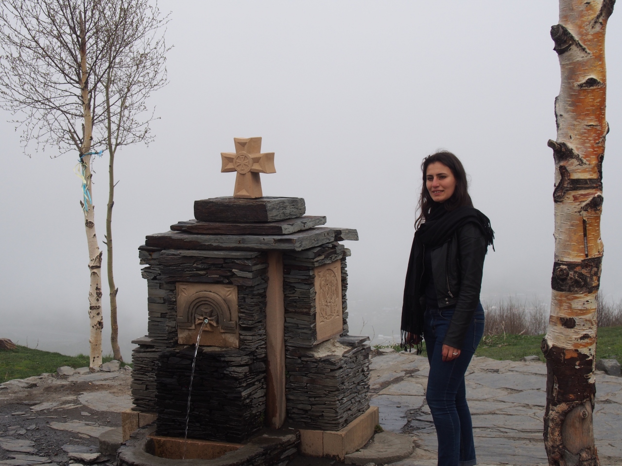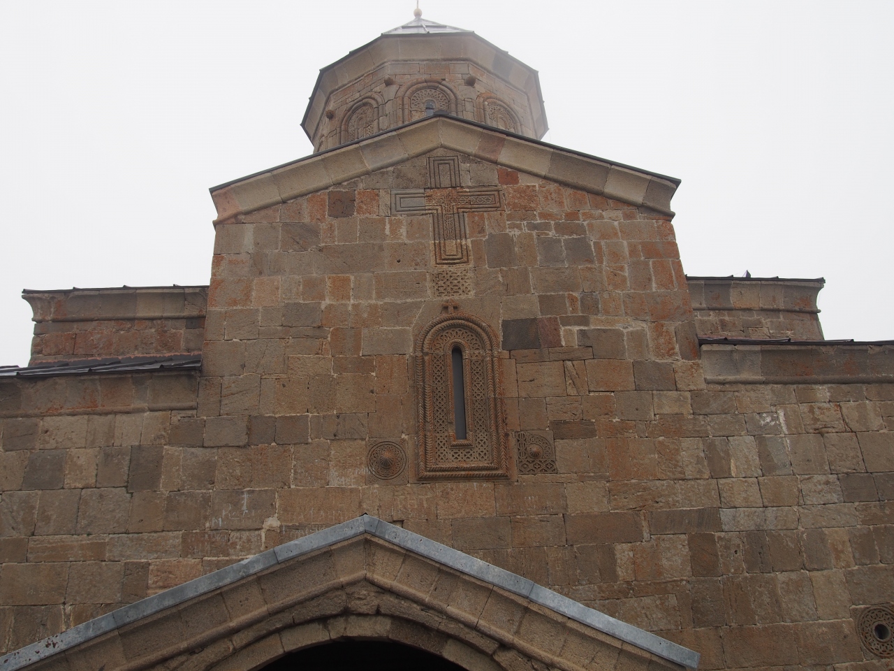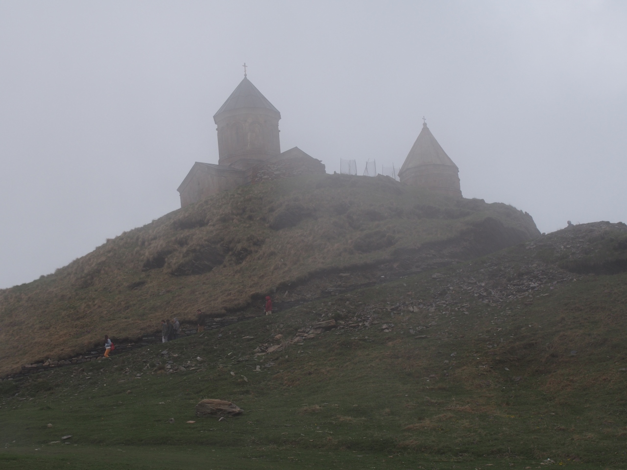 周りの大コーカサス山脈の岩壁、雪渓などの