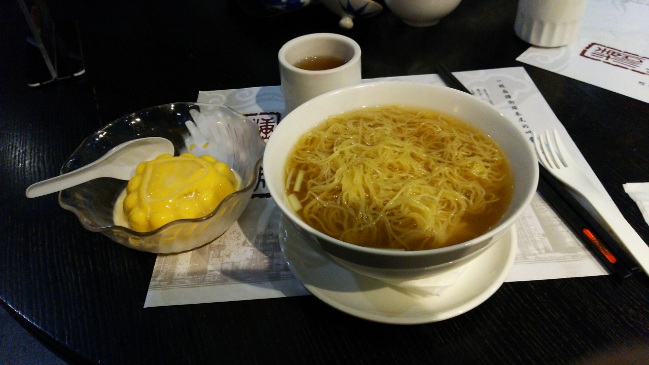 市内観光に組み込まれたランチにエビワンタンメンとマンゴープリンをいただきました