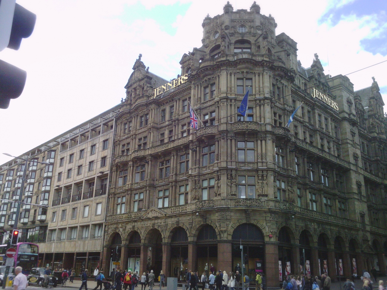 エディンバラのプリンセスストリートにあるジェナーズ。開店は1838年でイギリスでは2番目に古く歴史と格式のあるデパートです。王室御用達の看板が掲げられています。外観は宮殿にしか見えません、飲食店も入っているので観光に疲れた時はおしゃれな休憩スポットです。
