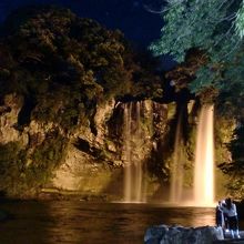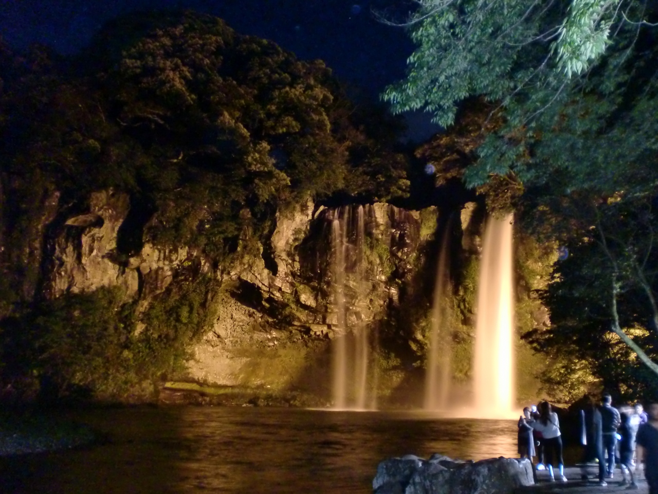 近くのチェジュハイキングインに宿泊した際に、夜もきれいですと聞いて、暗くなってから出掛けてきました。駐車場の食堂でアワビのヘムルトッペギを食べて、入口からぶらぶら歩いて10分程で滝に到着。とても綺麗でした。