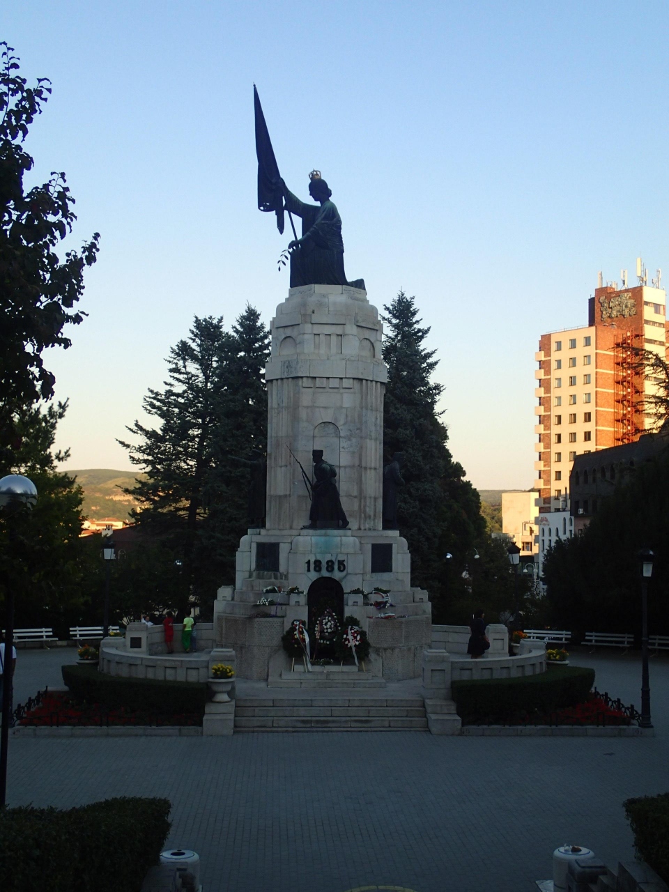 台の上には旗を掲げた女性の像があり、台の下には1885年と掘られ、