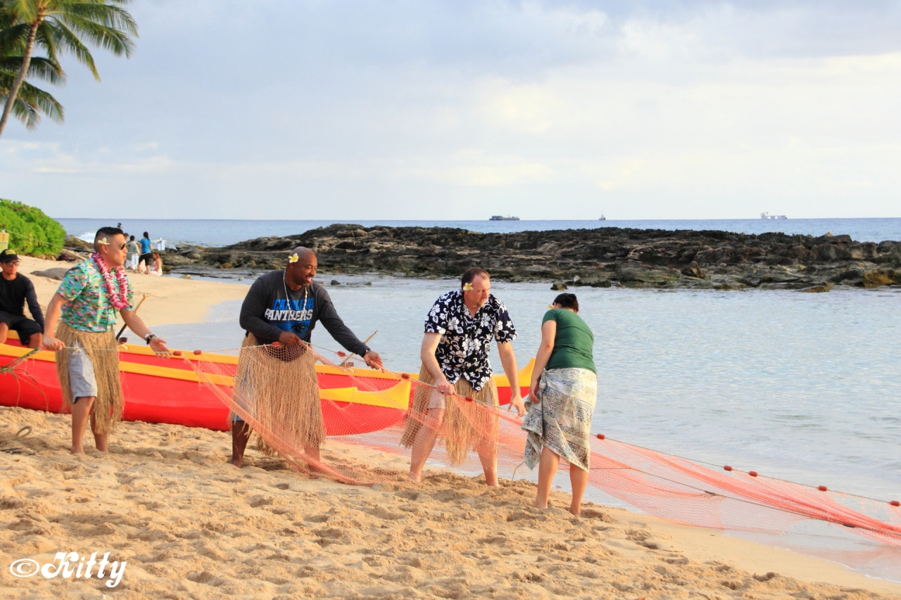 ショーの時間までは参加型アクティビティとなっていて、ゲームや工芸など子どもが楽しめるものや、お客さんが参加するフキラウというハワイの地引き網漁をやったりしていました。