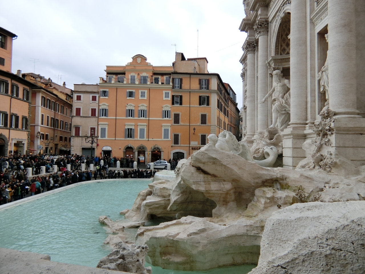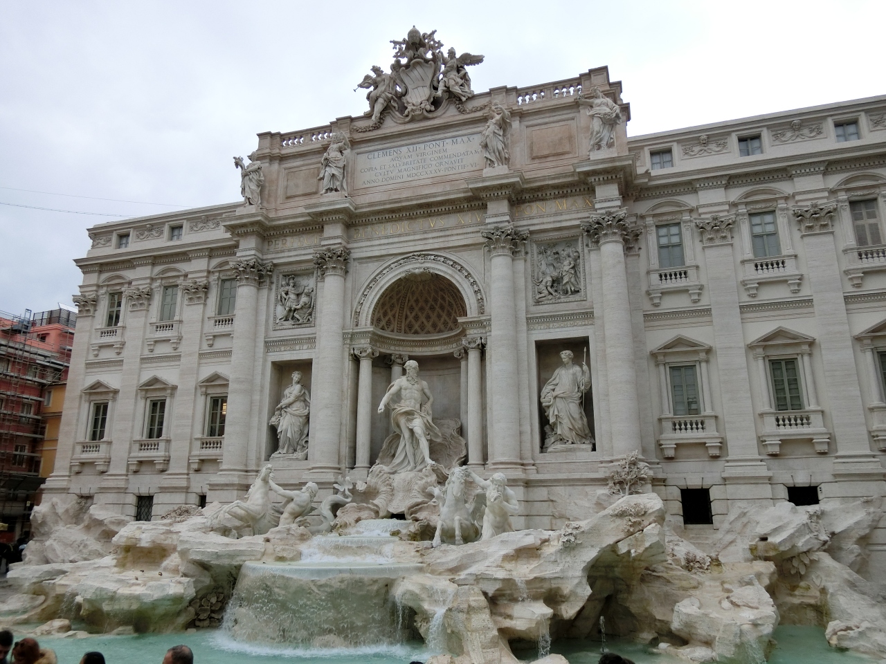 さてこのトレヴィの泉は2015年11月3日に修復が完成しました。噴水や泉の背後の建物の彫刻が修復されたそうです。修復されて間が無いため、白亜の彫像を目にすることが出来、感激です。
