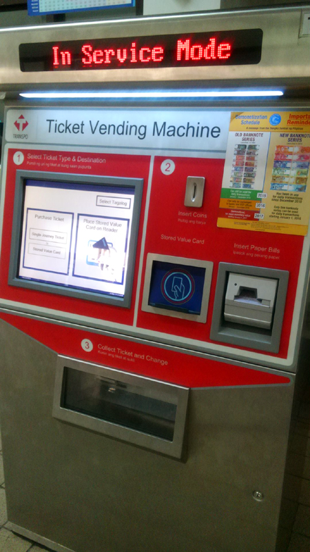 表示に従って、「Single Ticket」選択>「降車駅」選択>「Confirm」押す>「金額」表示>お金を挿入>チケットとお釣りを受け取る