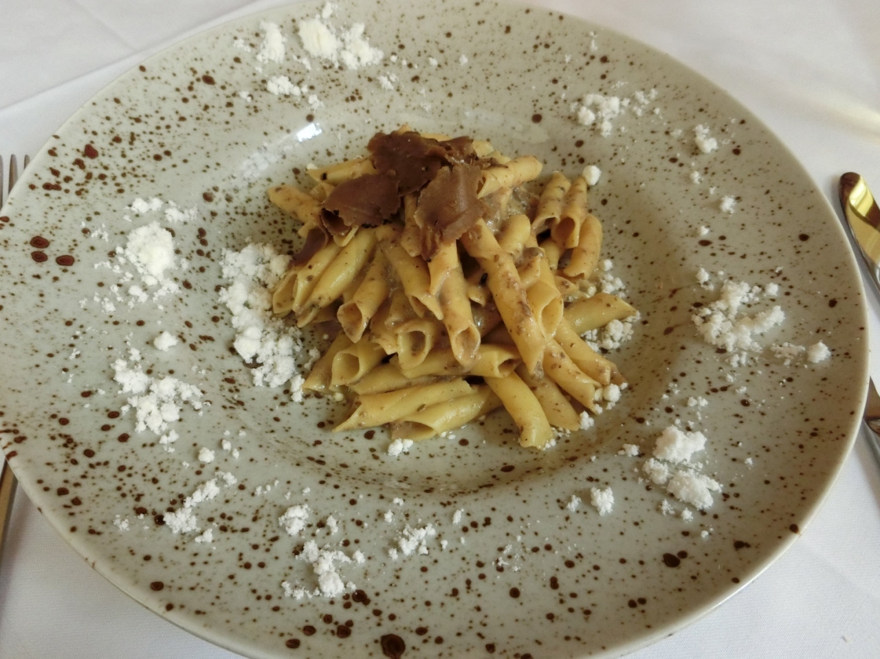 トリュフのパスタはトリュフのスライスや粉末などを用いており、加熱されている分、香りも存分に楽した。普段はパスタを食べるときにパンは一緒に頂かない自分だが、今回ばかりは旨いトリュフソースを逃さぬまいと、パンを使ってトリュフソースを堪能した。