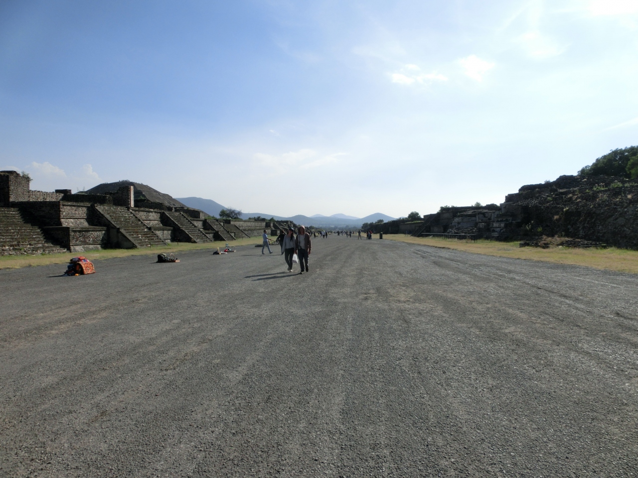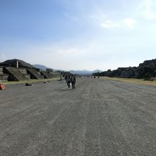 ティオティワカン遺跡の中にあるとても広い、ピラミッドを繋いでいる道です、月のピラミッドが端ですが、太陽のピラミッドで終わりでは無く、行ってはいませんがもっと続いていました、日差しを遮る物が無いので、天気の良い日はとても暑いです、道の両脇にも遺跡が有ります。