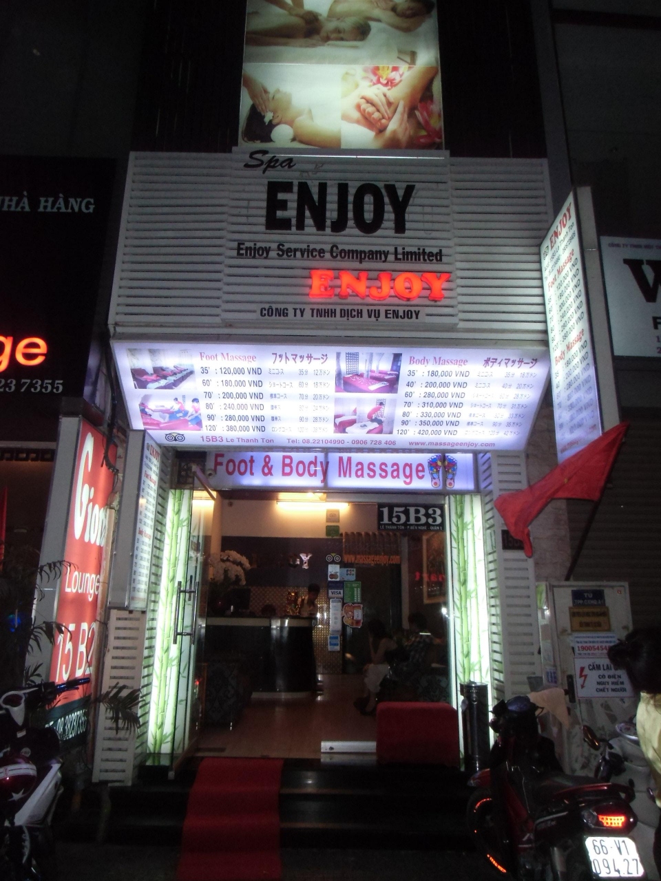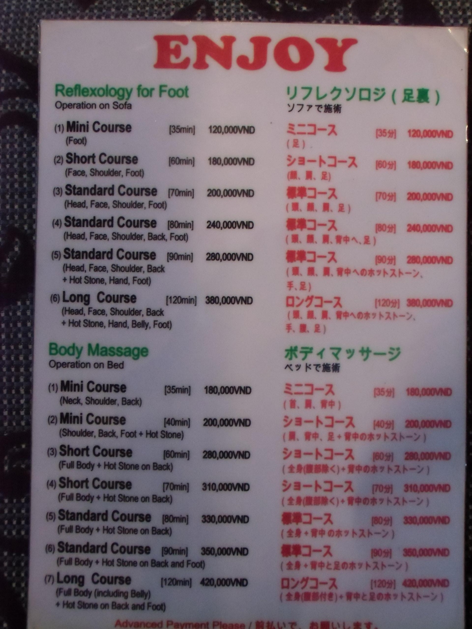 レタントン通りにあり、ドンコイ通りからを500mほど離れています。観光の中心地から少し離れますが、値段は一番安い部類です。受付では日本語も通用します。フットマッサージまたはボディマッサージを選び、35分~120分までの5種類の中から時間を選びます。他の店と違うことは料金前払いなことと、フットマッサージでも服と短パンに着替えることです。荷物と自分の服はロッカーに入れ、鍵は自分で管理します。値段はチップ込で、標準の70分ならフットマッサージが20万ドン(約1000円)、ボディマッサージが31万ドン(約1550円)です。