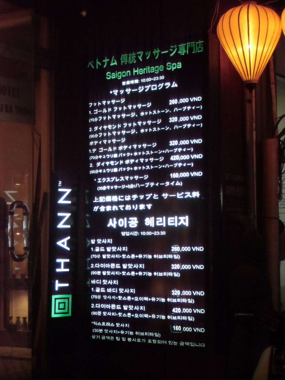 ハイバーチュン通りにあるフットマッサージとボディマッサージの専門店です。他のマッサージ専門店より高級感のあるお店で雰囲気はとても良いです。女性の方でも安心して入れるお店です。インフレで値上げする店が多い中、この店は2年前より1~2万ドン値下げされていました。フットマッサージはチップ込で70分が26万ドン(約1300円)、90分が32万ドン(約1600円)。ボディマッサージはチップ込で70分が32万ドン(約1600円)、90分が42万ドン(約2100円)でした。