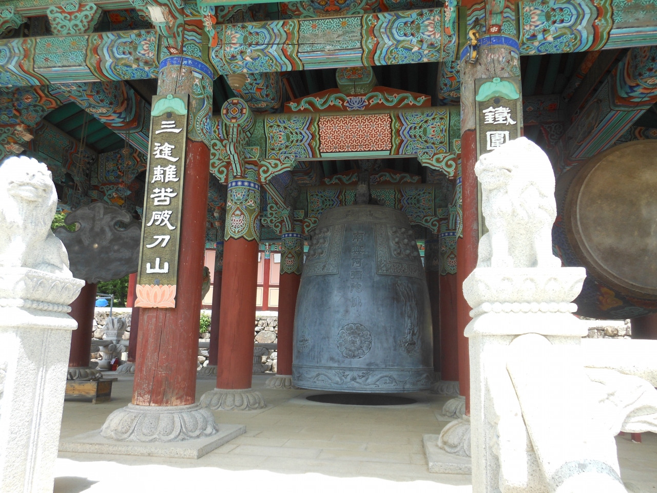 韓国のお寺に見られる独特の色彩鮮やかな 建物に囲まれて リンとして置かれています。