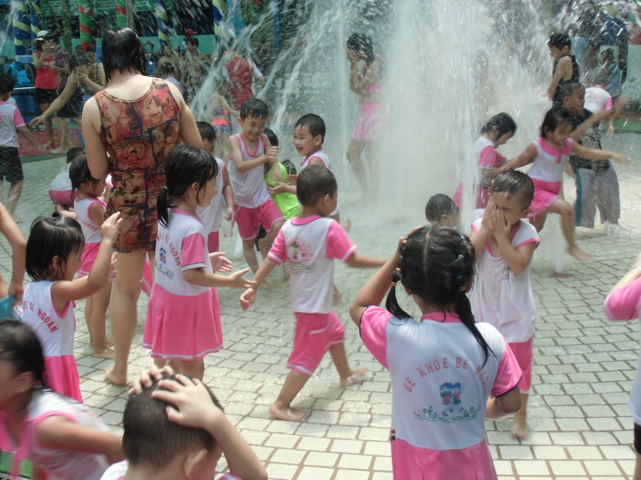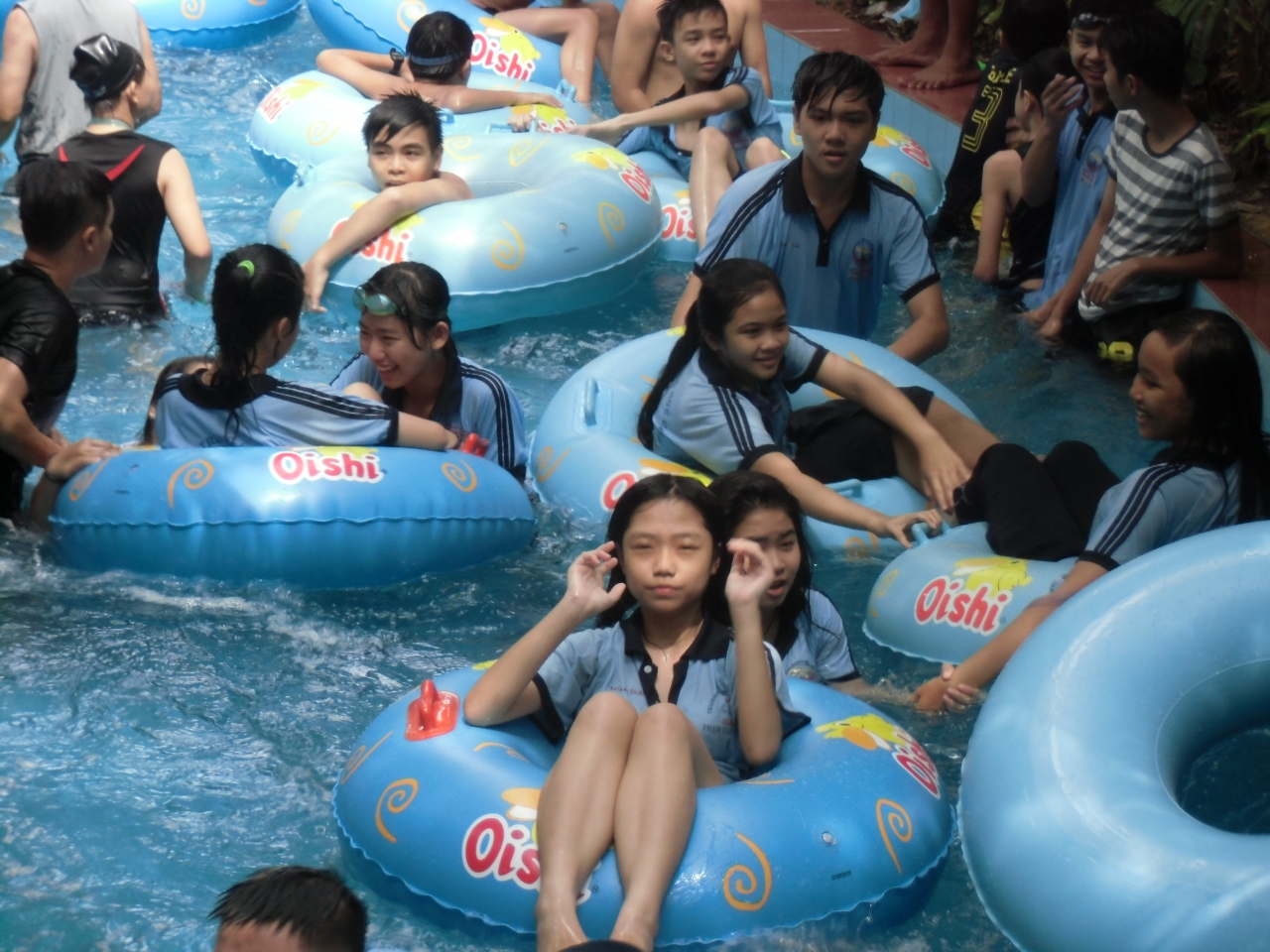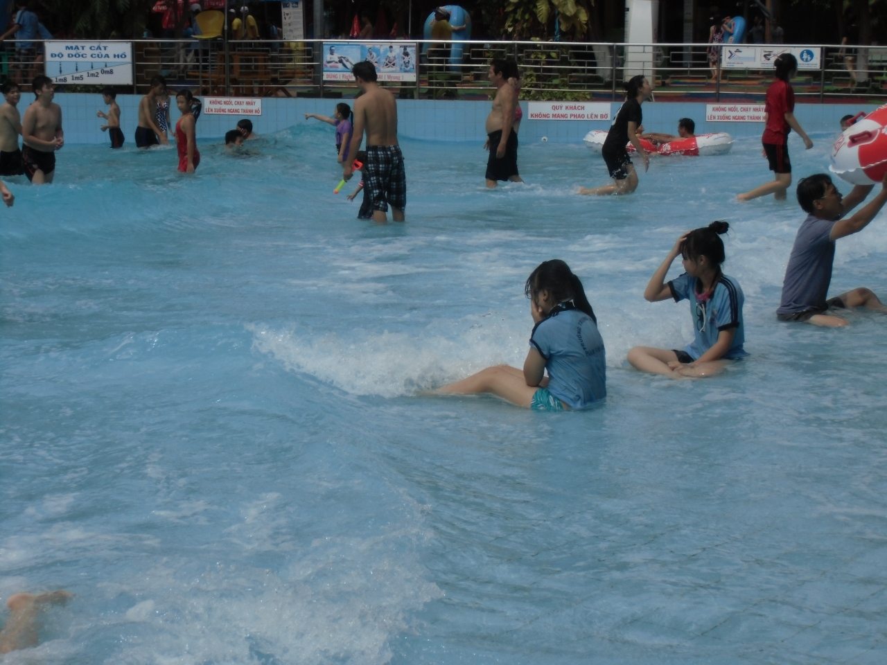 ダムセン公園は遊園地として紹介されることが多いと思いますが、併設するウォーターパークも楽しめますよ。ウォーターパークの入場料は身長140cm以上14万ドン(約650円)とベトナムにしては高額ですが、この日は土曜日ということもあってか朝8時でも結構多くの人がいました。以前よりも水着着用率は高くなっていましたが、幼稚園や中学生の遠足の子どもたちは相変わらず制服のままで泳いでいました。スライダー4種類、波の出るプール、流れるプールもあります。食堂も街中で食べるより安い価格です。