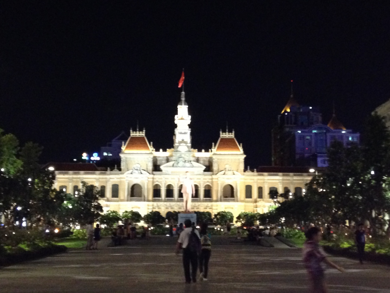 スクエアに入るのにわたる横断歩道に押しボタン式信号がありました押すとベトナム語で大きなアナウンスがあり恥ずかしかったです。スクエアはバラ咲いていて人民委員会が後ろに見えて素敵な雰囲気でした、夜に行くと人民員会のライトアップは映えるし噴水の水が出て(結構勢いよく上がりました)楽しかったです。