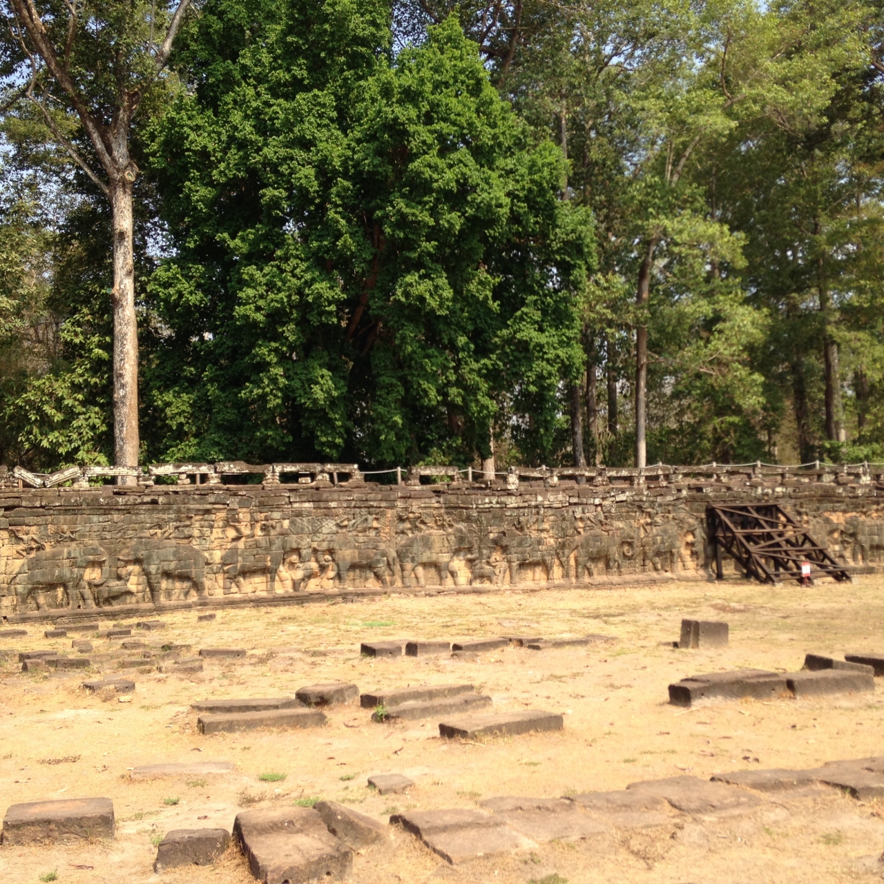 テラスから離れた正面に塔が複数あり、その間を綱渡りするのをテラスから王様が見ていたそうです、優雅な王朝を想像しました。壁面も像が沢山彫刻されていて角は立体的な像でした像のテラスは道路沿いを歩き木陰がなくて暑く無理して行かなくていいかと思いました。