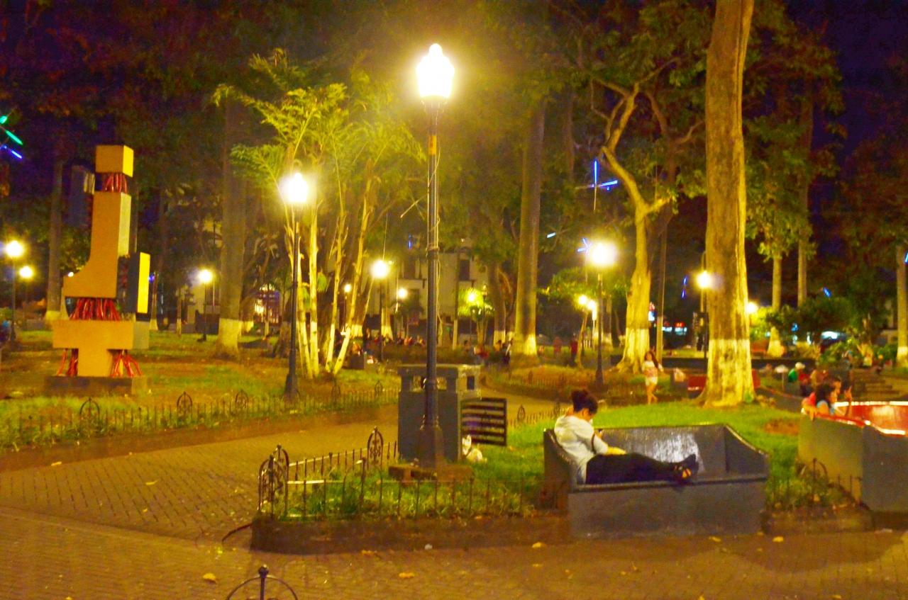 カテドラルの正面に広がる、アラフエラの中心部に位置する中央公園。樹木が植えられ広場はとても静か。市民の憩いの場となっている。ベンチも多いので旅の途中に休息を取るのに最適だ。広場は22時頃でも治安は維持されている。
