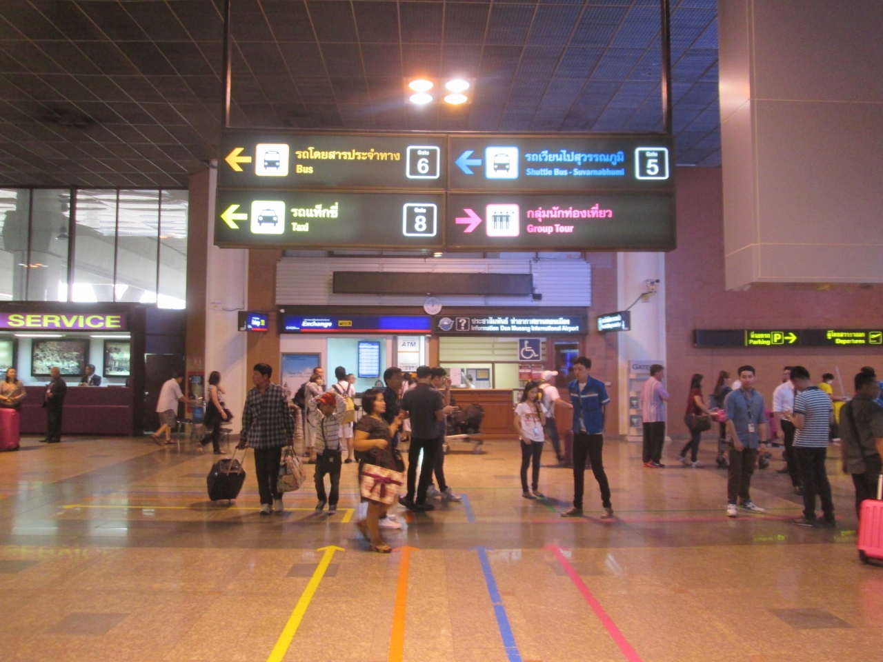 到着階に市内への交通機関のサインがあります。出て左に進むと交通機関になり、5番がシャトルバス、6番がバス、8番がタクシー乗り場となります。鉄道の駅はあるものの現実的ではなく、市内への交通手段は限られています。