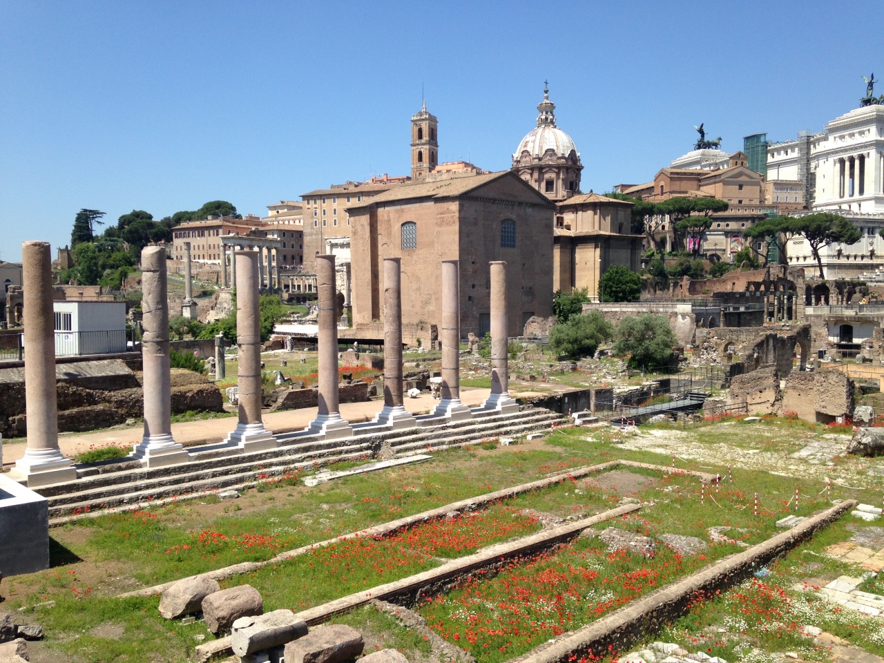フォーリ・インペリアーリ通りにあるチケットゲートでコロッセオとのセットチケットを購入(€12)チケットを購入して、入場の列に並び替え入場ゲートに入るまでに1時間かかりました。天気の良い日でかなり暑かったので、この時点で体力はかなり消耗しました。中に入ると古代ローマ時代の神殿跡が多数ある。いろいろな遺跡があるので、旅行本を見ながら見た方が、古代ローマの想像が出来て楽しい。ゆっくり見て1時間、パラティーノの丘と合わせ、2時間強かかりました