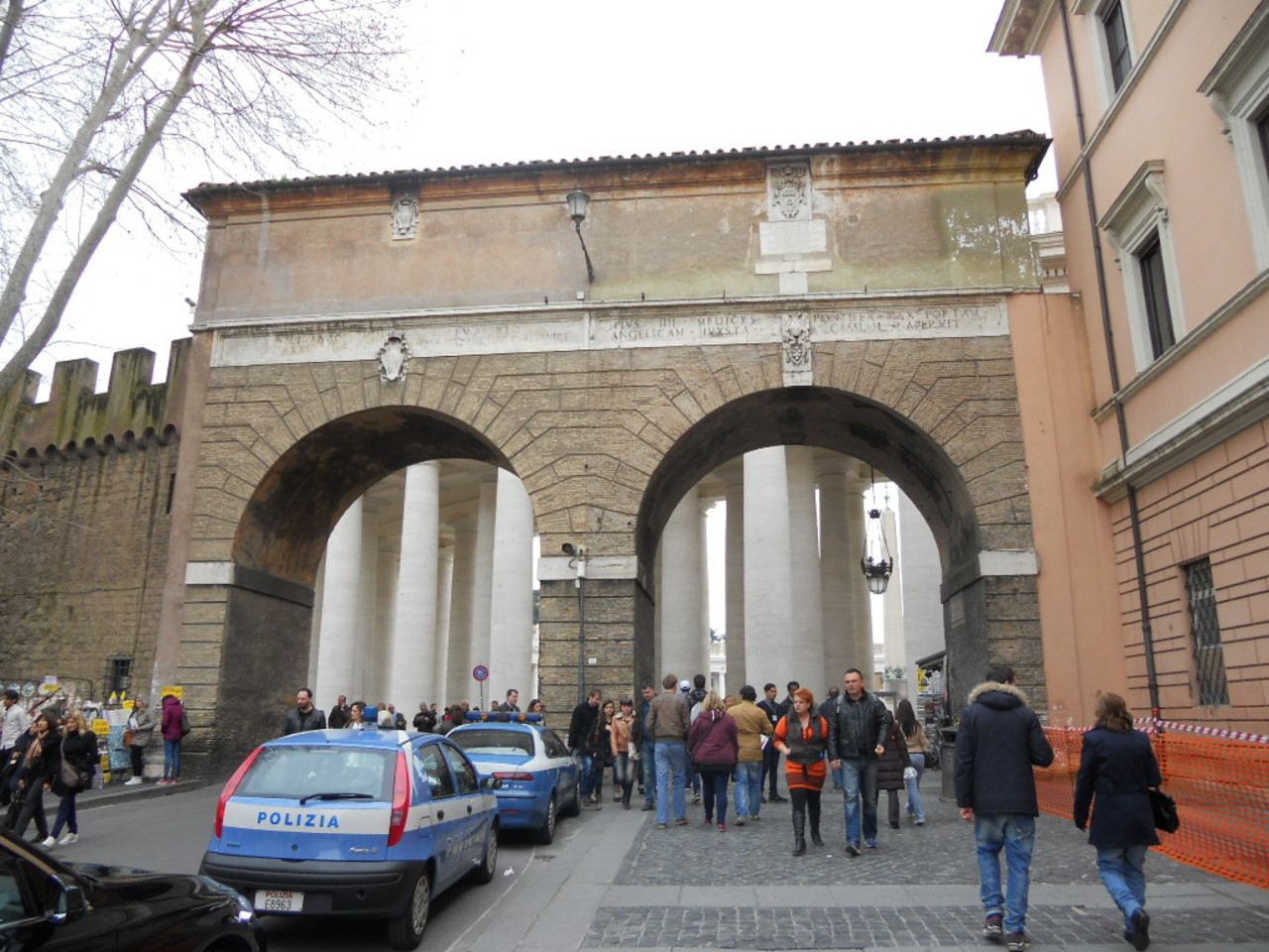 イタリアとヴァチカンの国境にある門です。ヴァチカン美術館からサン・ピエトロ広場に行く時に通りました。門をくぐるとサン・ピエトロ広場に出ます。独立した門ではなく、城壁の一部が門になっているという感じでした。