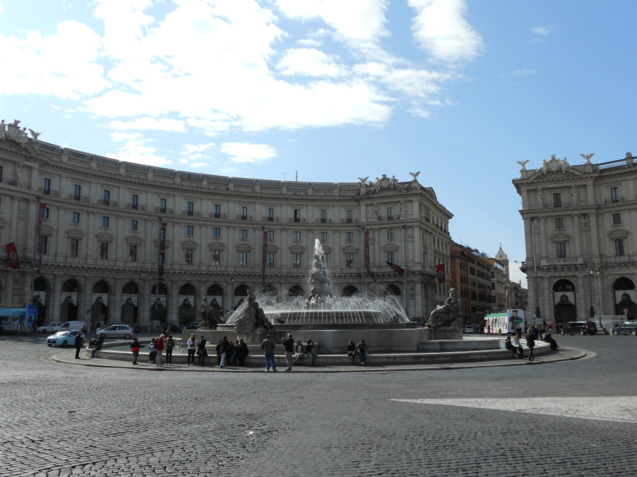 大きなロータリーとなっている円形の広場で、中央に噴水があります。最寄り駅はレプッブリカ駅ですが、テルミニ駅からも十分歩いていける距離です。周囲の建物との調和が美しい広場だと思いました。ロータリーは交通量が多いです。