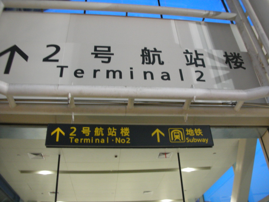 天津浜海空港に到着後、市内へはタクシーまたは地下鉄が便利です。当空港は比較的新しい施設のようで案内板がやや少ないように感じます。国際線で到着後、空港の地下鉄駅までの道筋が初めての方にはわかりにくいです。国際線は第1ターミナルなので駅がある第2ターミナルまで相当歩く必要があります。写真は第1ターミナルから第2ターミナルに向かうときの案内表示です。