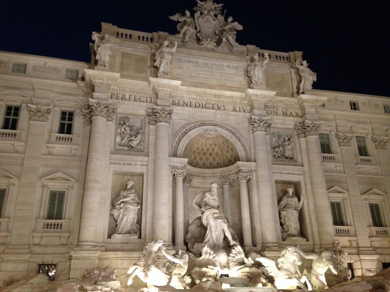 これぞローマのシンボルといえる場所で、いつ行ってもとても混んでいます。昨年までの工事が終わり今は綺麗になった状態で見れます。夕食をすませ21時頃に行ったにも関わらず、トレビの泉の前の広場はお祭り状態の激混みでした。あまりに混んでいたため階段の上の方で写真を撮り、帰りました。でも夜はライトアップされて昼と違った魅力があります