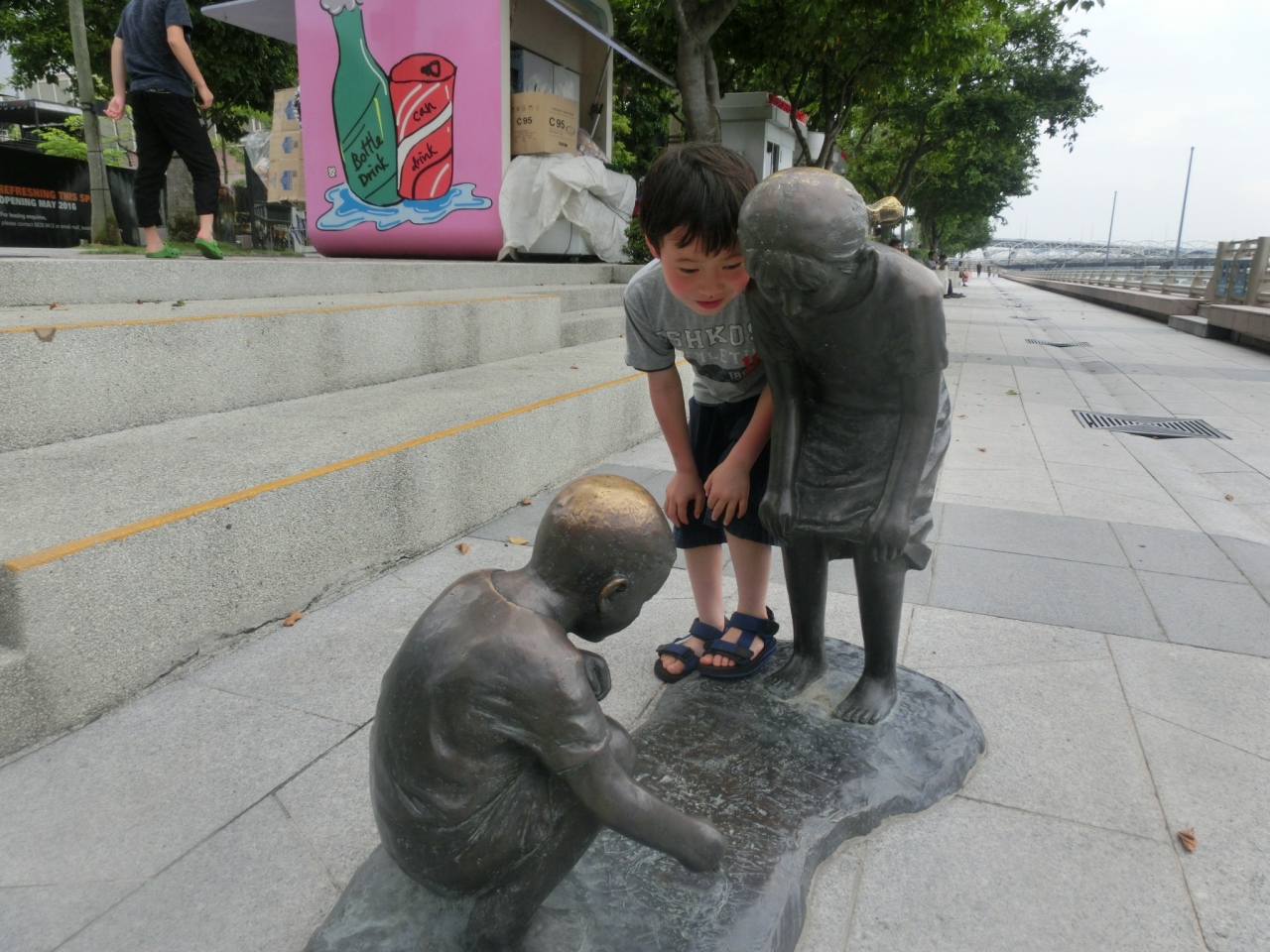 ちょうど昼間にマーライオンパークからシンガポールフライヤーまでの道のりで歩きました。昼間に歩く場所ではありません。とにかく暑いです。途中、北海道ソフトクリームが売ってたので、それを食べて、やっと体が冷えました。夜や朝早くの散策がいいと思います。