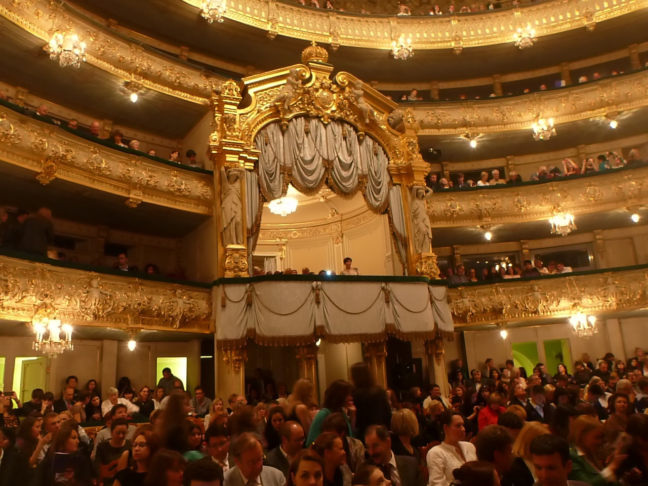 1860年に完成したという劇場の外側は明るいパステルカラーに彩られています。客席は歴史を感じられるもので、VIP席にもちょこっと入っていくことが出来ました。ロシア帝国時代だと皇帝等でないと入られなかったのでしょう。