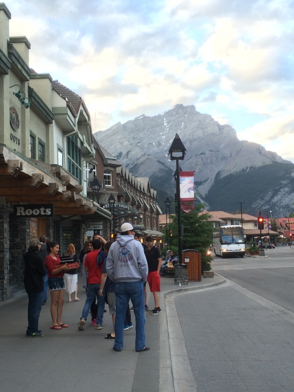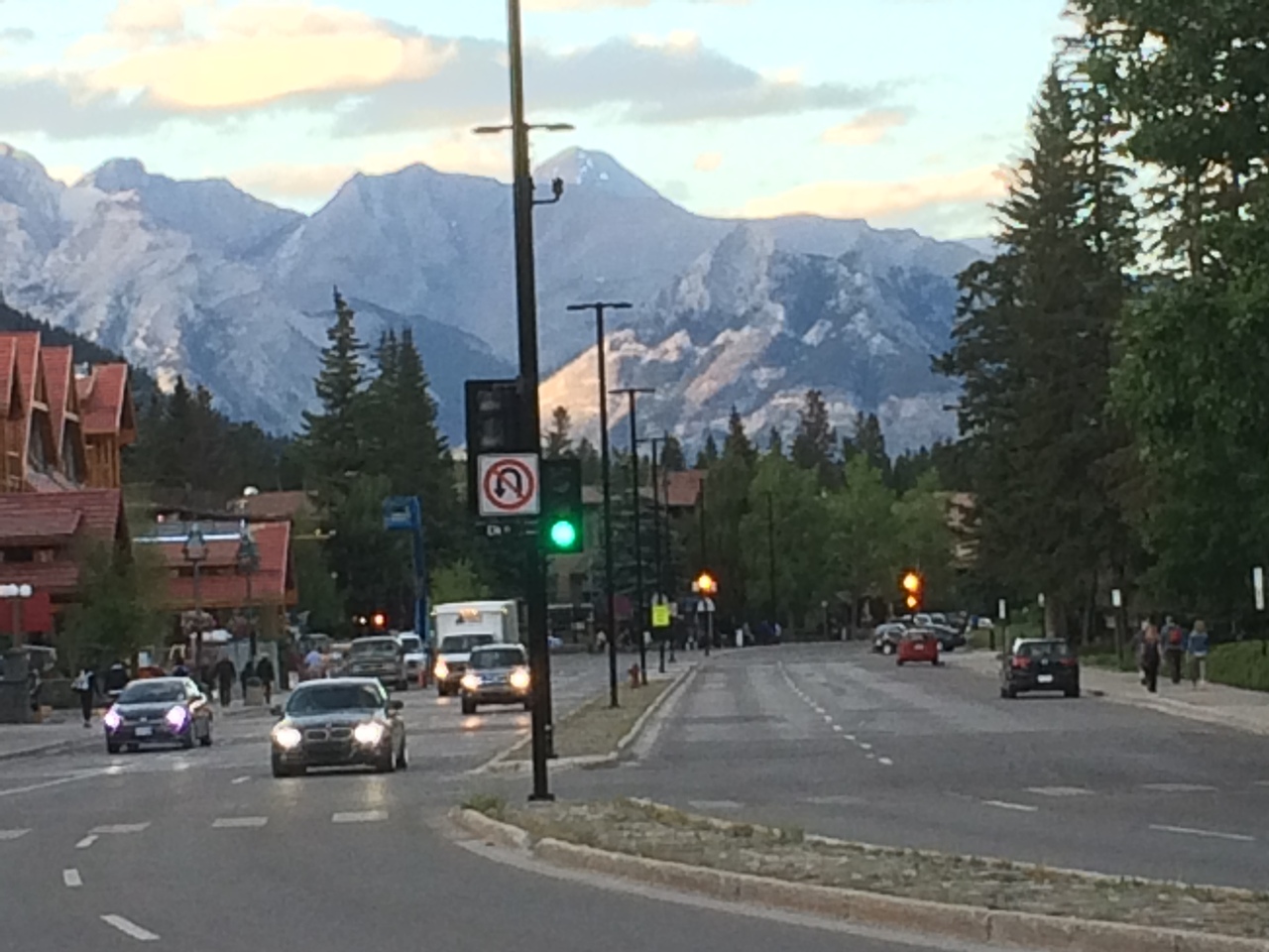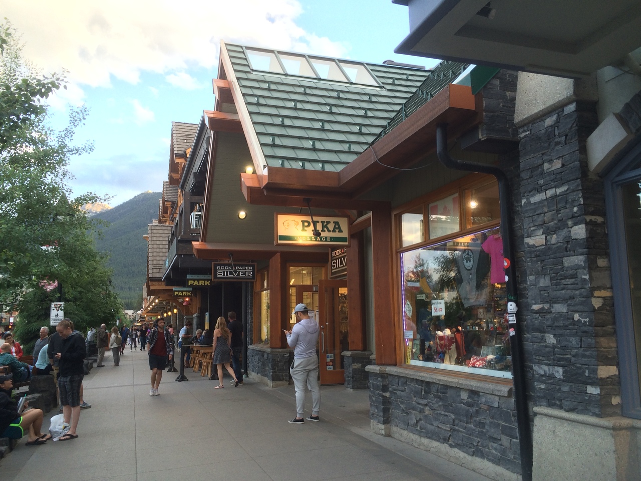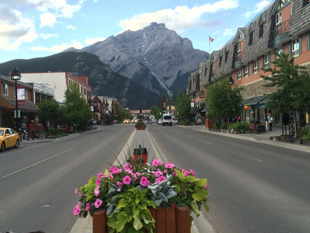 バンフは人口9,500人ほどのこじんまりした町ですが世界中の観光客が集まるリゾート地です。メインストリートであるバンフ・アベニューにはギフトショップ・アウトドアショップ、アクセサリー、スイーツ、ロッキー山脈名物とも言える化石の宝石やアンモナイトなどを扱うショップ、レストラン、スーパー、ホテルなどが軒を連ねています。ただ賑やかなエリアは20分もあれば制覇できてしまうくらいのサイズです。店舗は21時~22時くらいまでオープンしています。メインストリートから3000m級の山々が連なるロッキー山脈がすぐそこに迫っていて散歩していても気分が高揚してくる華やいだ感じの街です。